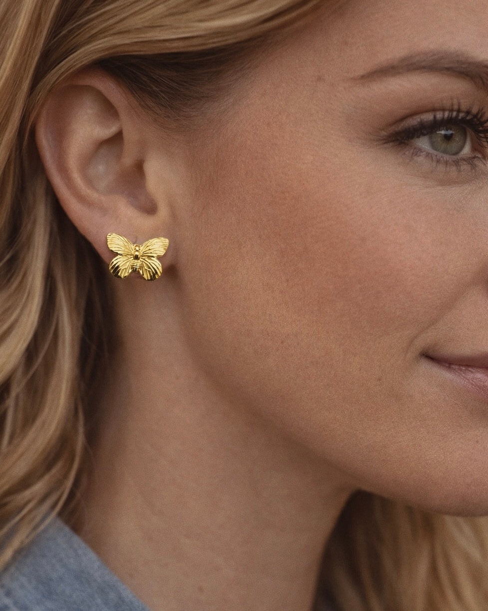Our 18k gold plated Butterfly earrings are the perfect studs! Add a cute and cool touch to your daily look. 18k Gold plated stainless steel! These are a leave in all day, no tarnish, no ear irritation piece!