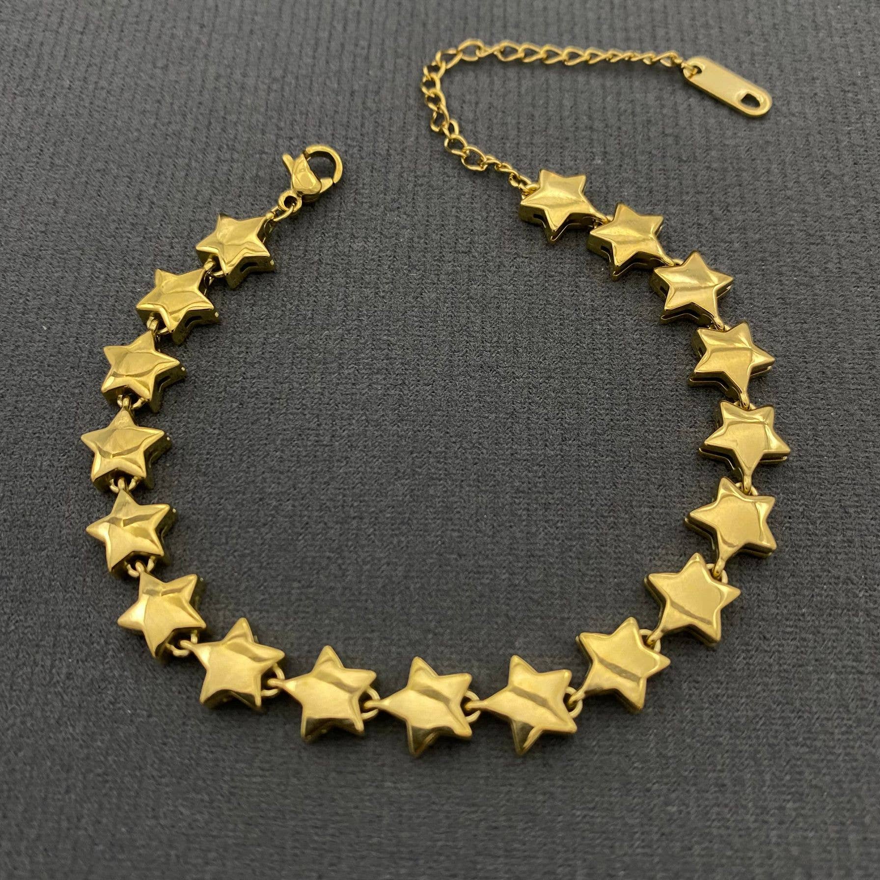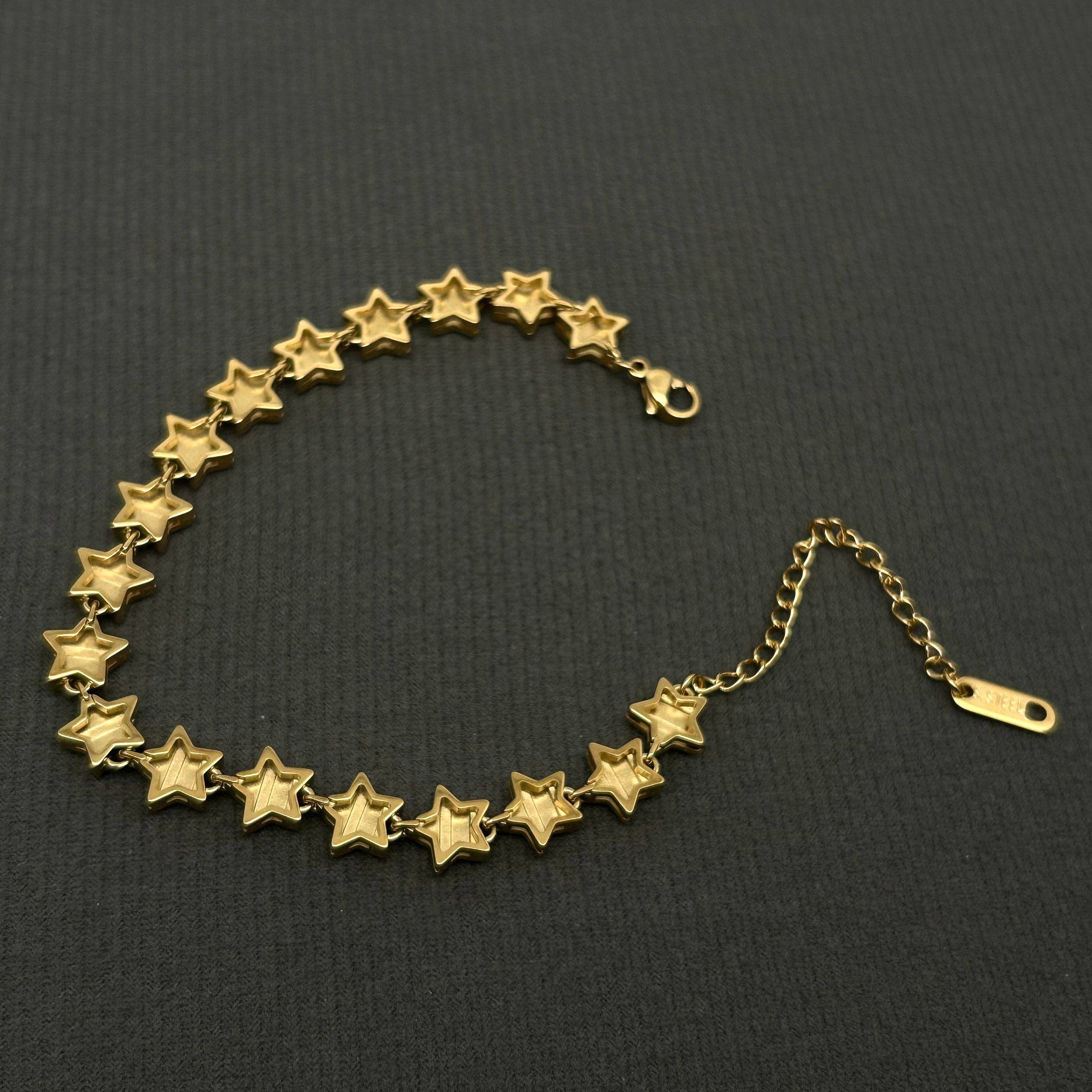 Our 18k gold plated stainless steel stainless steel bracelet is the iconic statement piece you have been waiting for. All on her own or layered into your stack this is a show stopper. Add depth and charm with the 3d gold star charms.