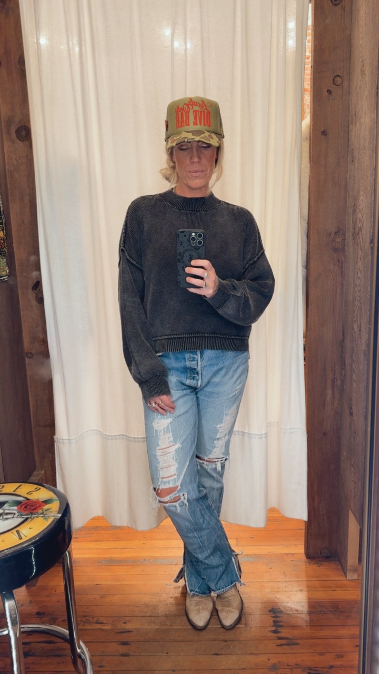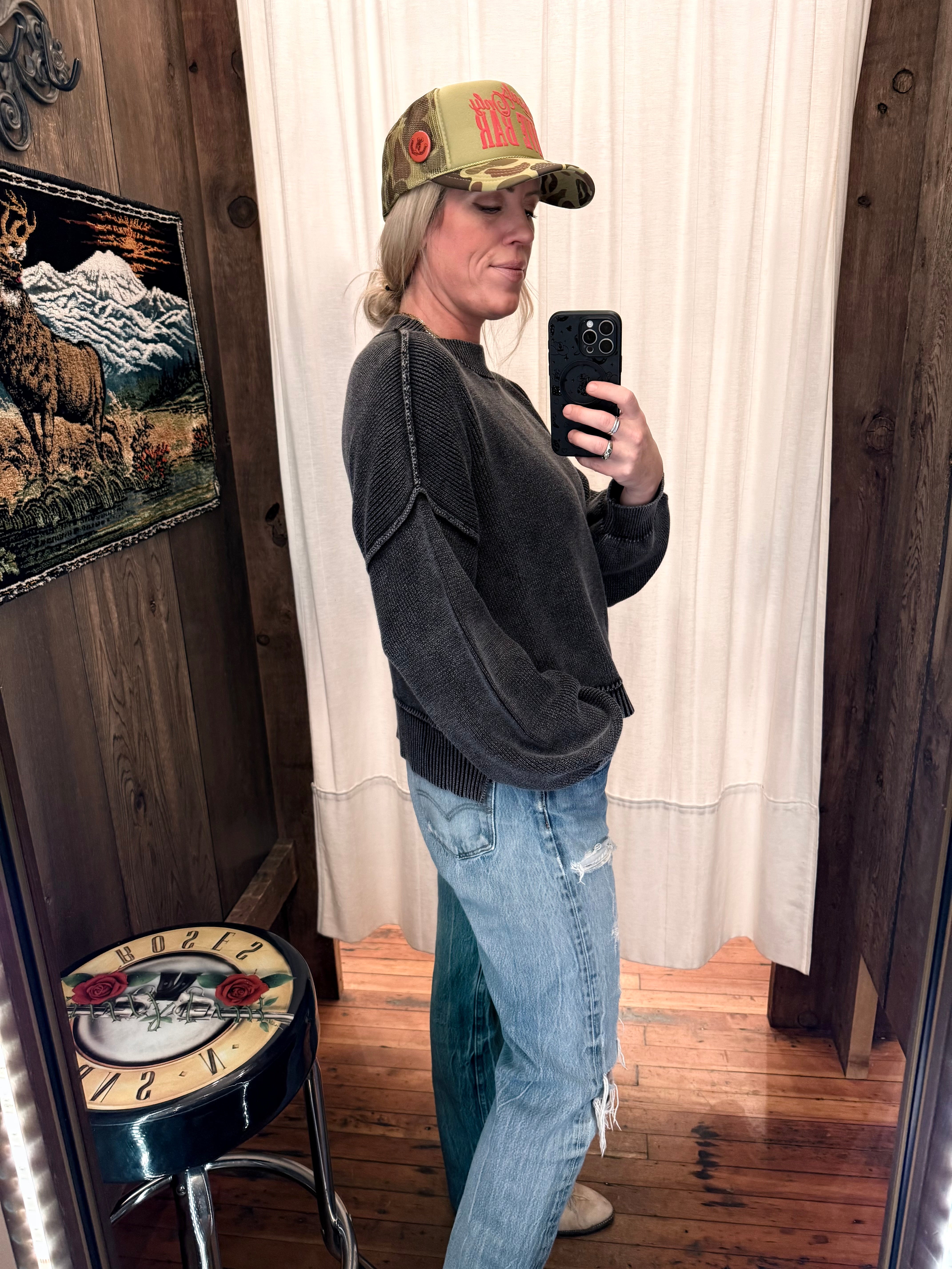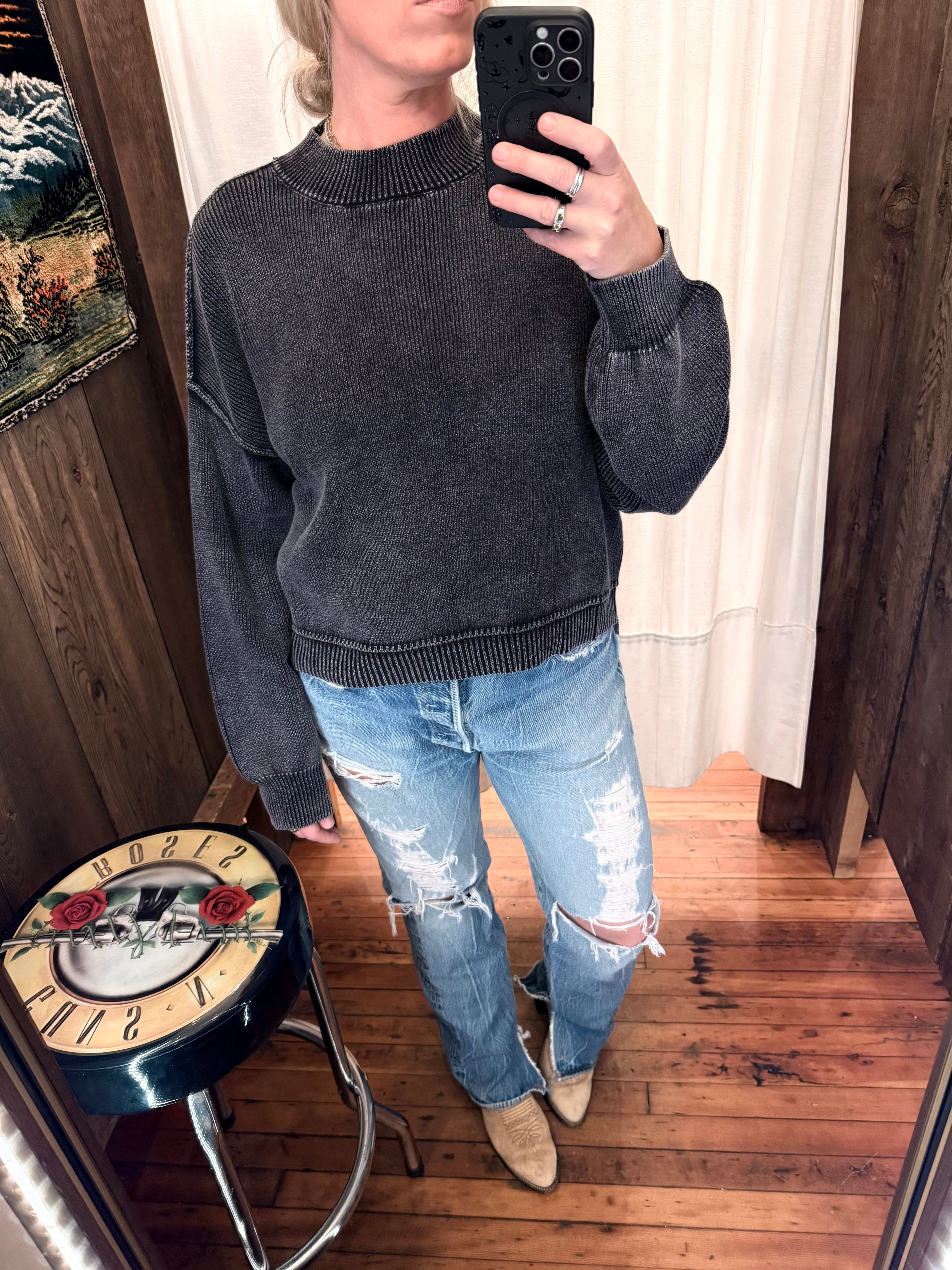 Nothing in your closet should be boring, not even your basics. Elevate your standards with Sid. Our Mock Neck Pullover Sweater, with an inside out stitch effect and washed grey; this will add to your look.