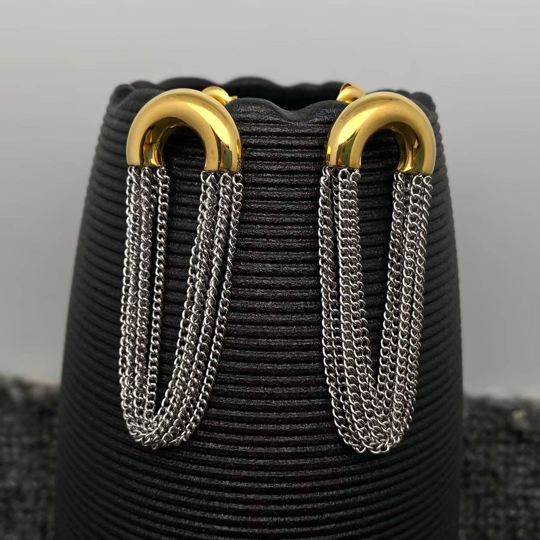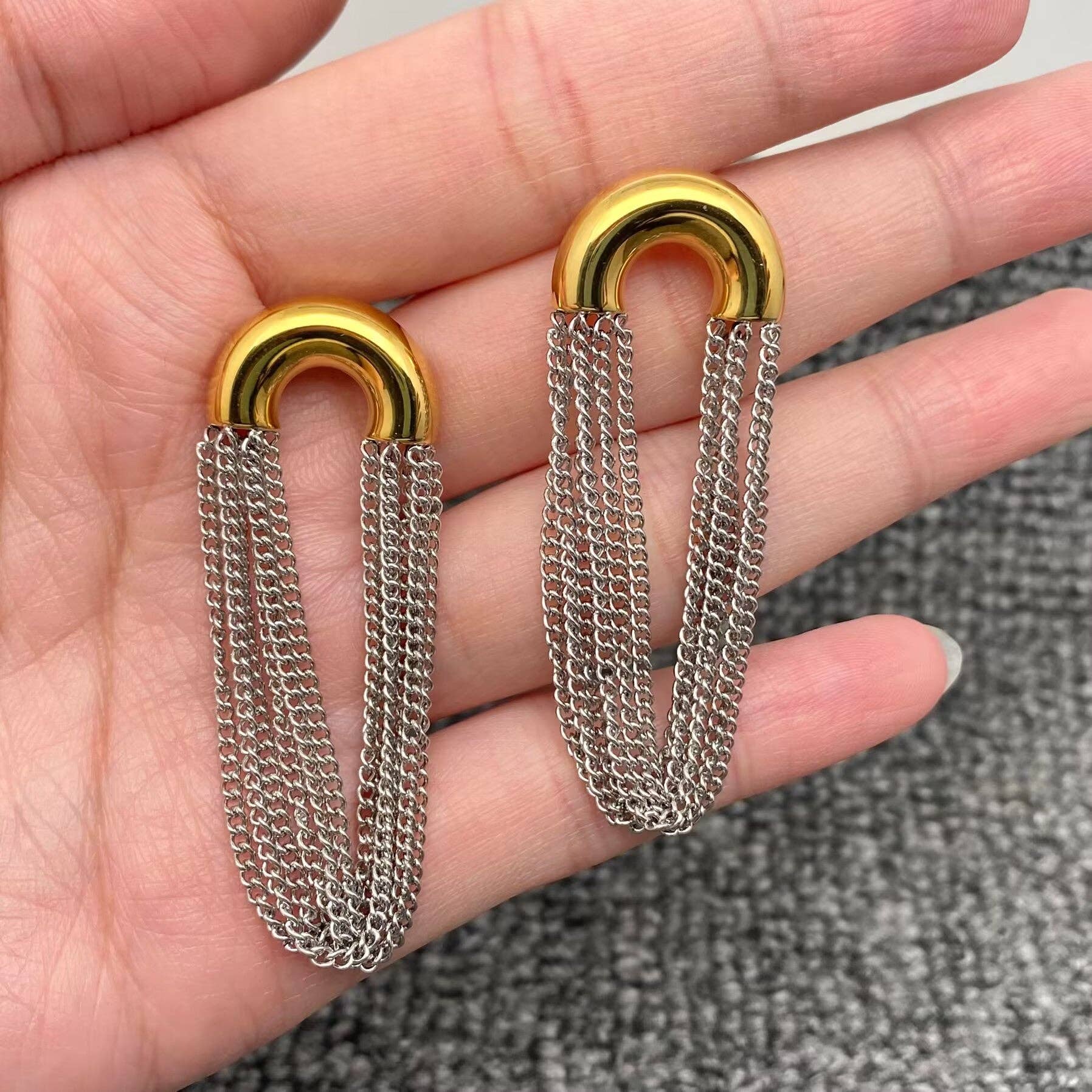 Our Charlie two tone earrings are a stunning piece, with stainless steel chains, and an 18k gold plated top. These two tone dangly studs are easy to match with any outfit. Dress up or down, these lightweight dangly studs are the perfect go to.