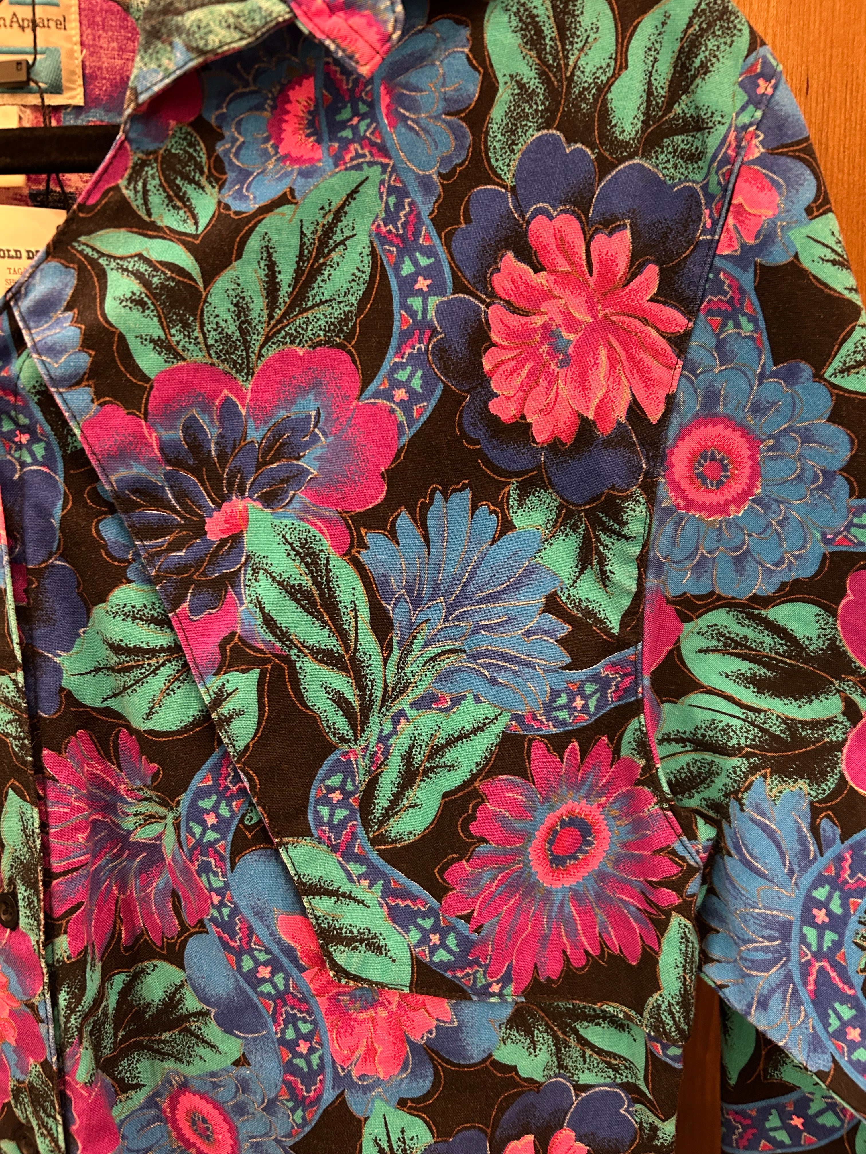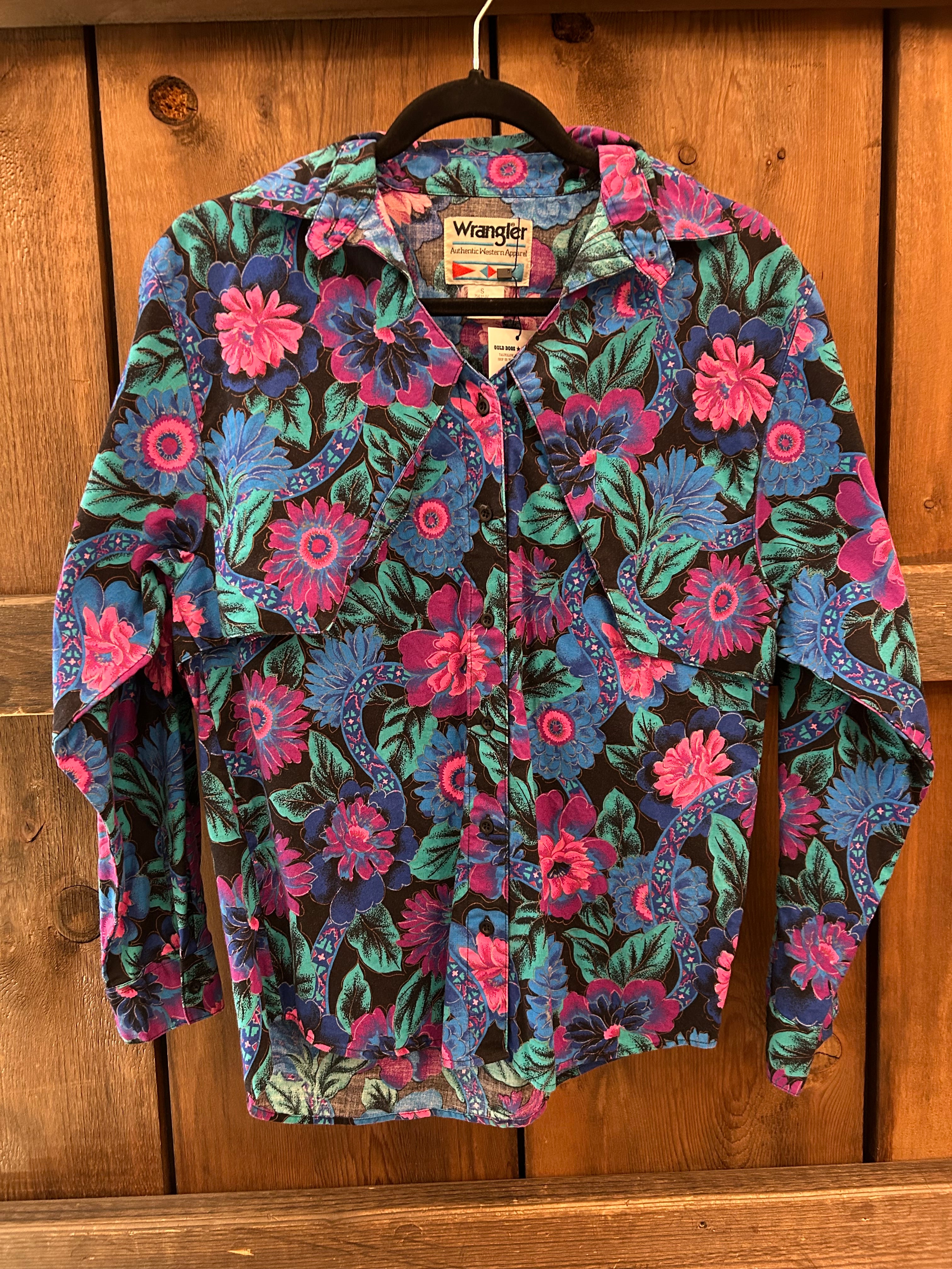 This unique Vintage Wrangler Western Button Up shirt is one of those Vintage finds that sticks with you forever. With a vibrant floral design, time did not fade this color one bit! This Vintage Wrangler measures to a true Men’s Small!