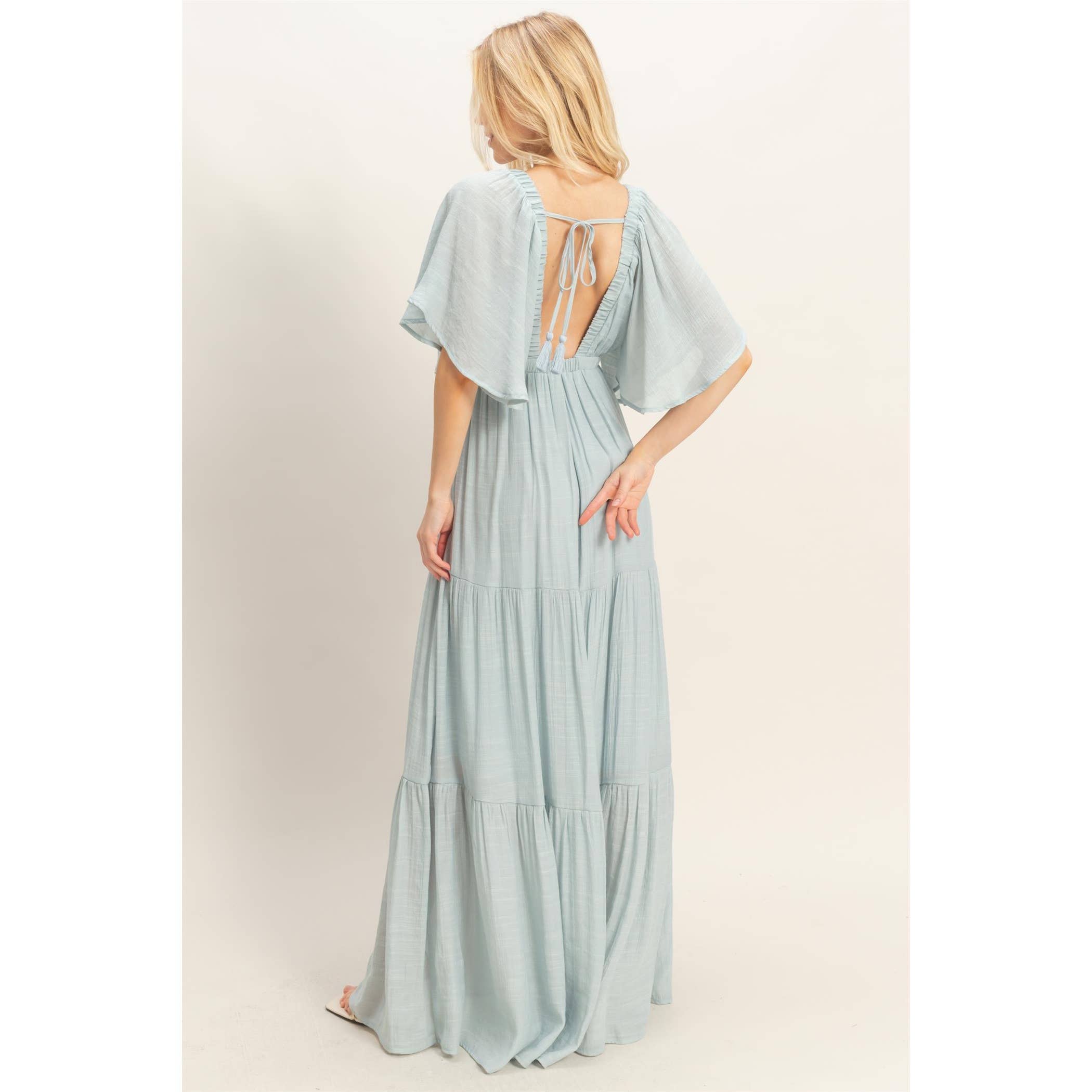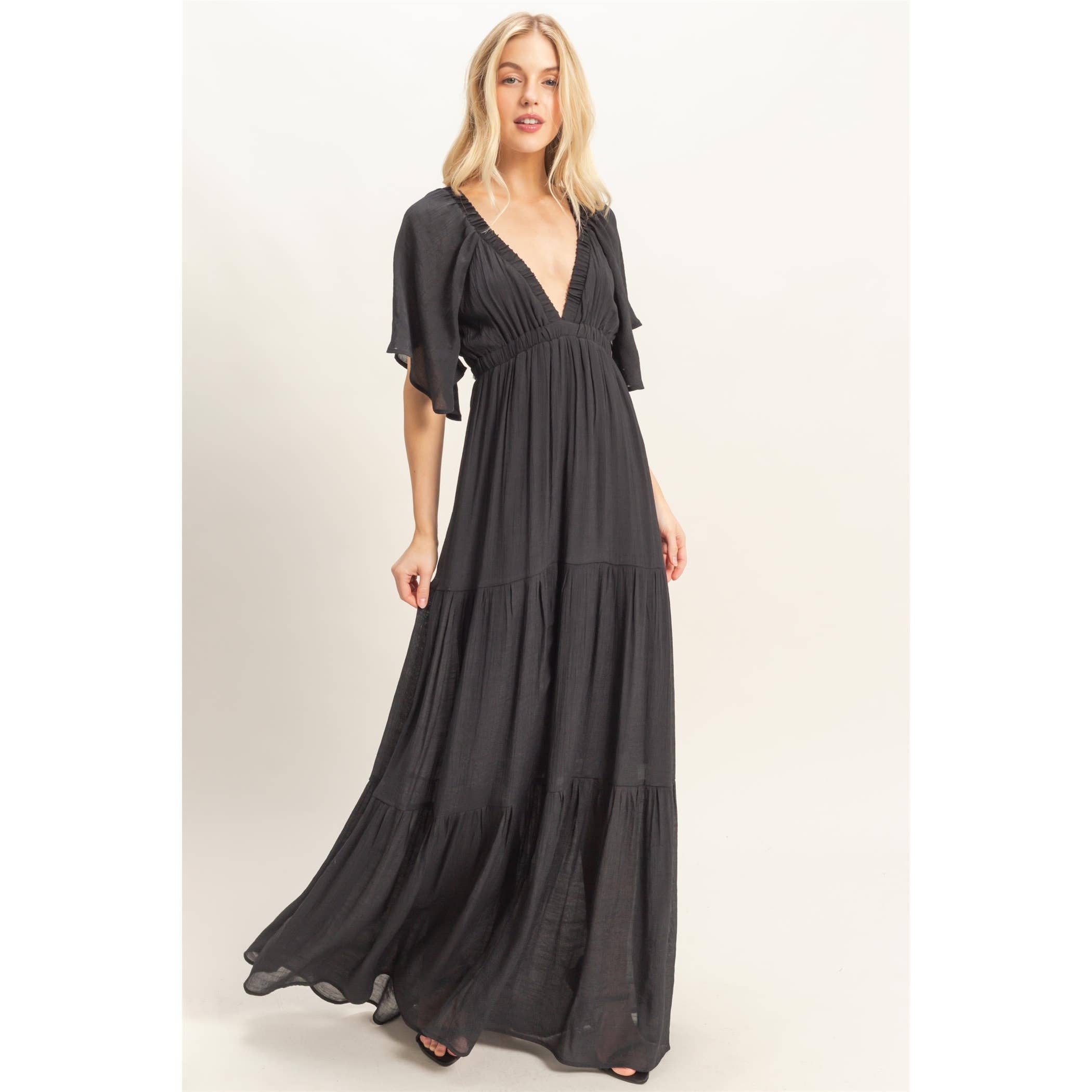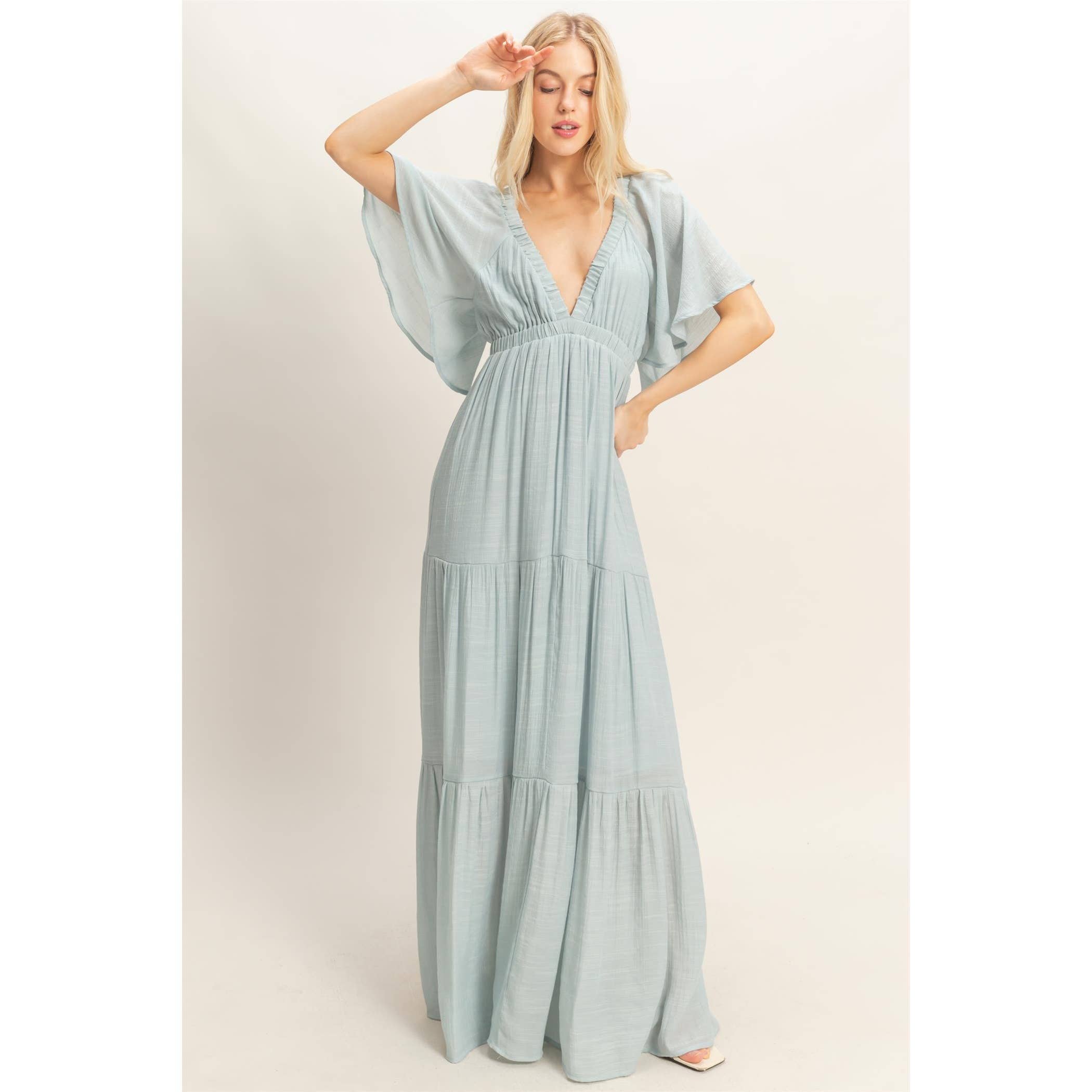 Our Cruel Summer Butterfly sleeve maxi dress was designed for free spirited sunny days. With a deep front v-neck open back, and elastic waistband this bohemian free spirited look will turn heads.