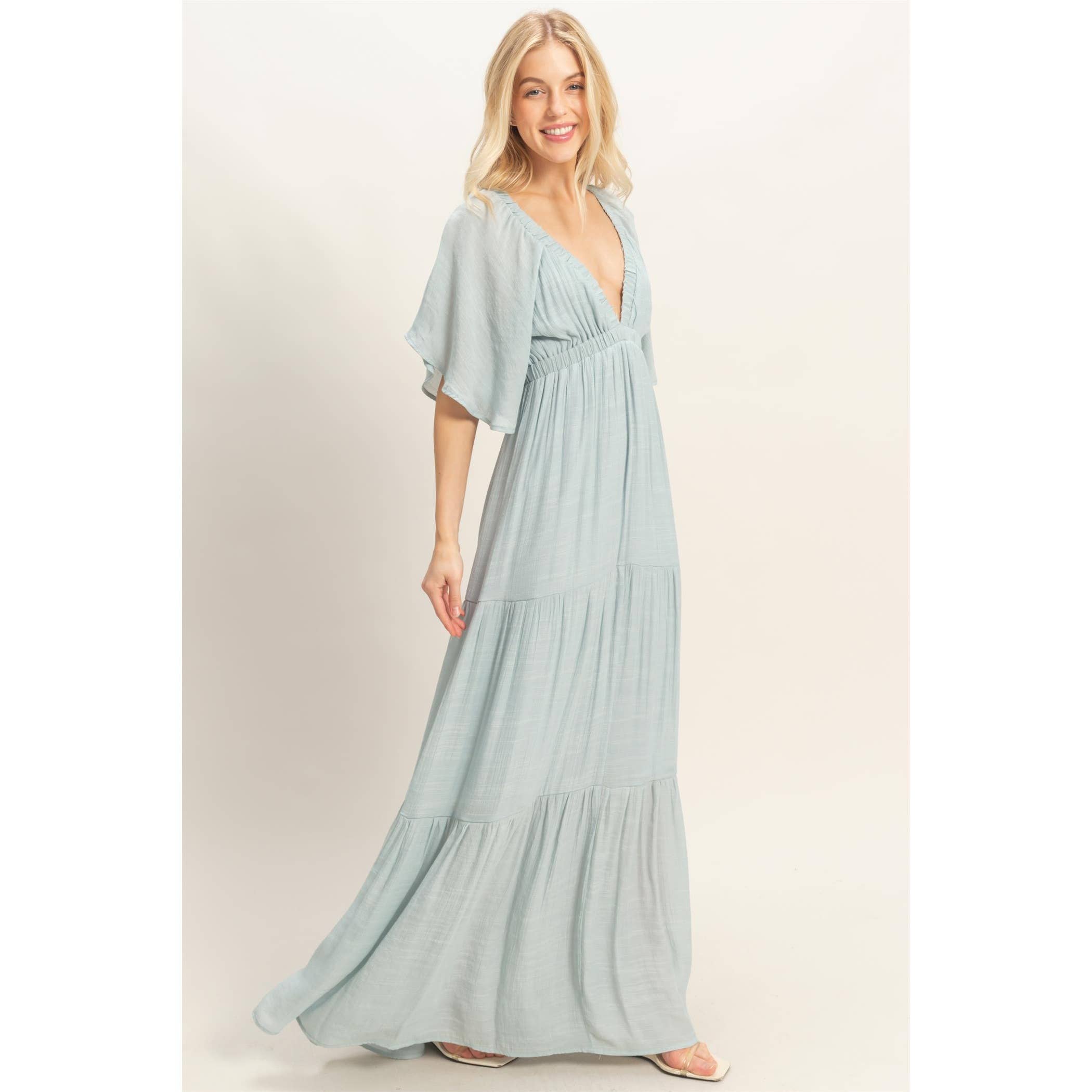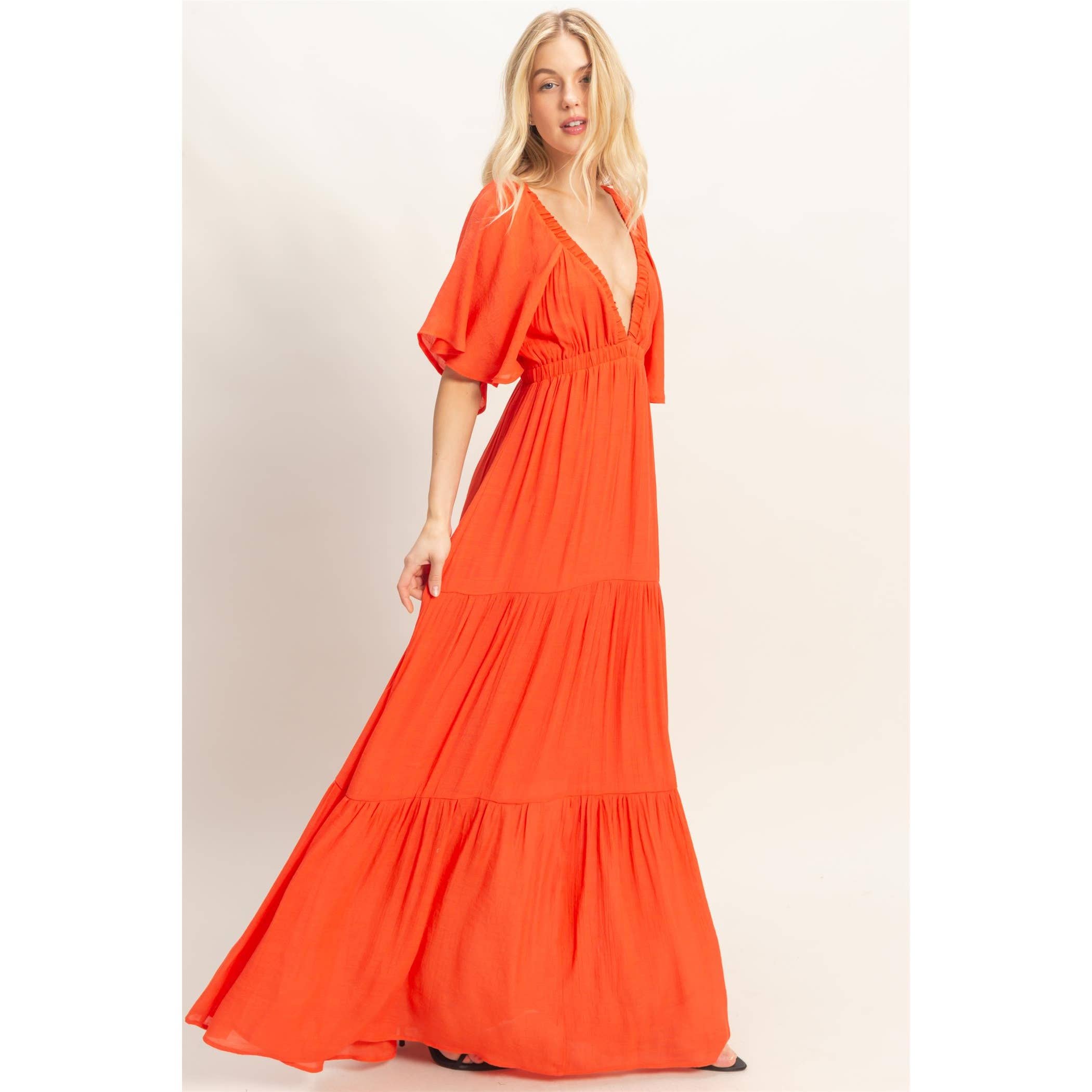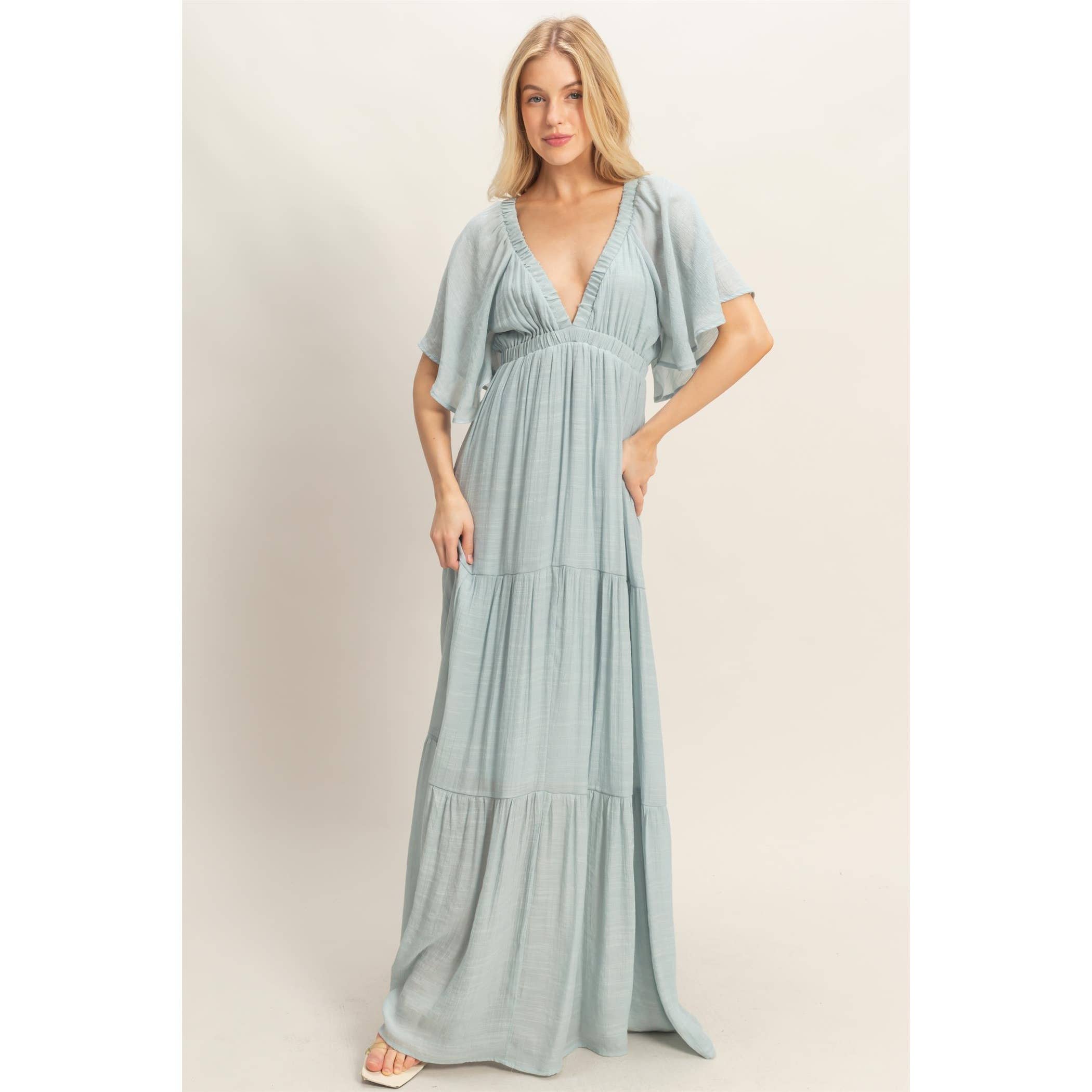 Our Cruel Summer Butterfly sleeve maxi dress was designed for free spirited sunny days. With a deep front v-neck open back, and elastic waistband this bohemian free spirited look will turn heads.