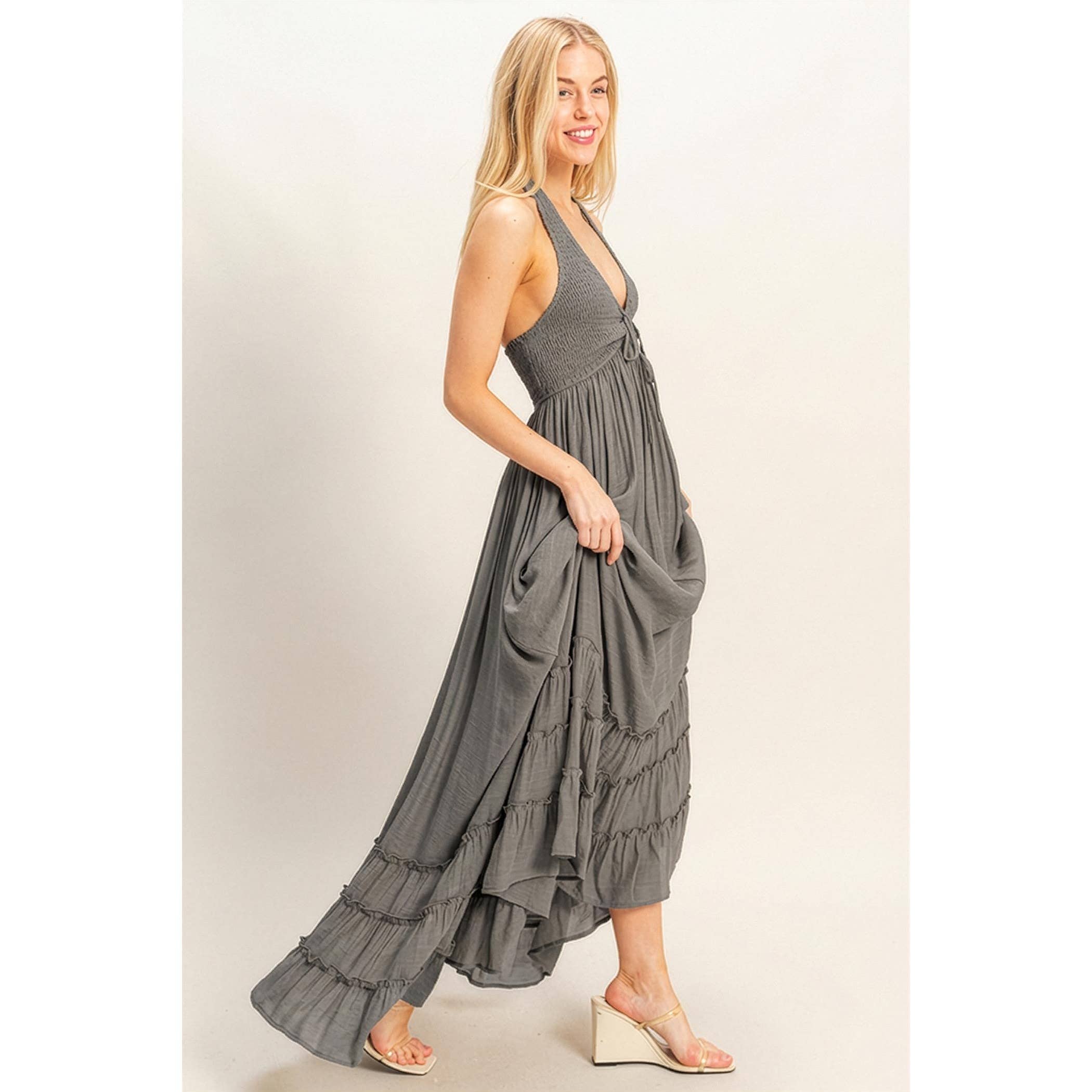 Our Sunday smocked halter maxi dress is the staple for spring Sumer. With the perfect peekaboo under the deep v-neck and open back the details on this dress are one of a kind. Her layered skirts gives the elevated look to a cool comfy dress.