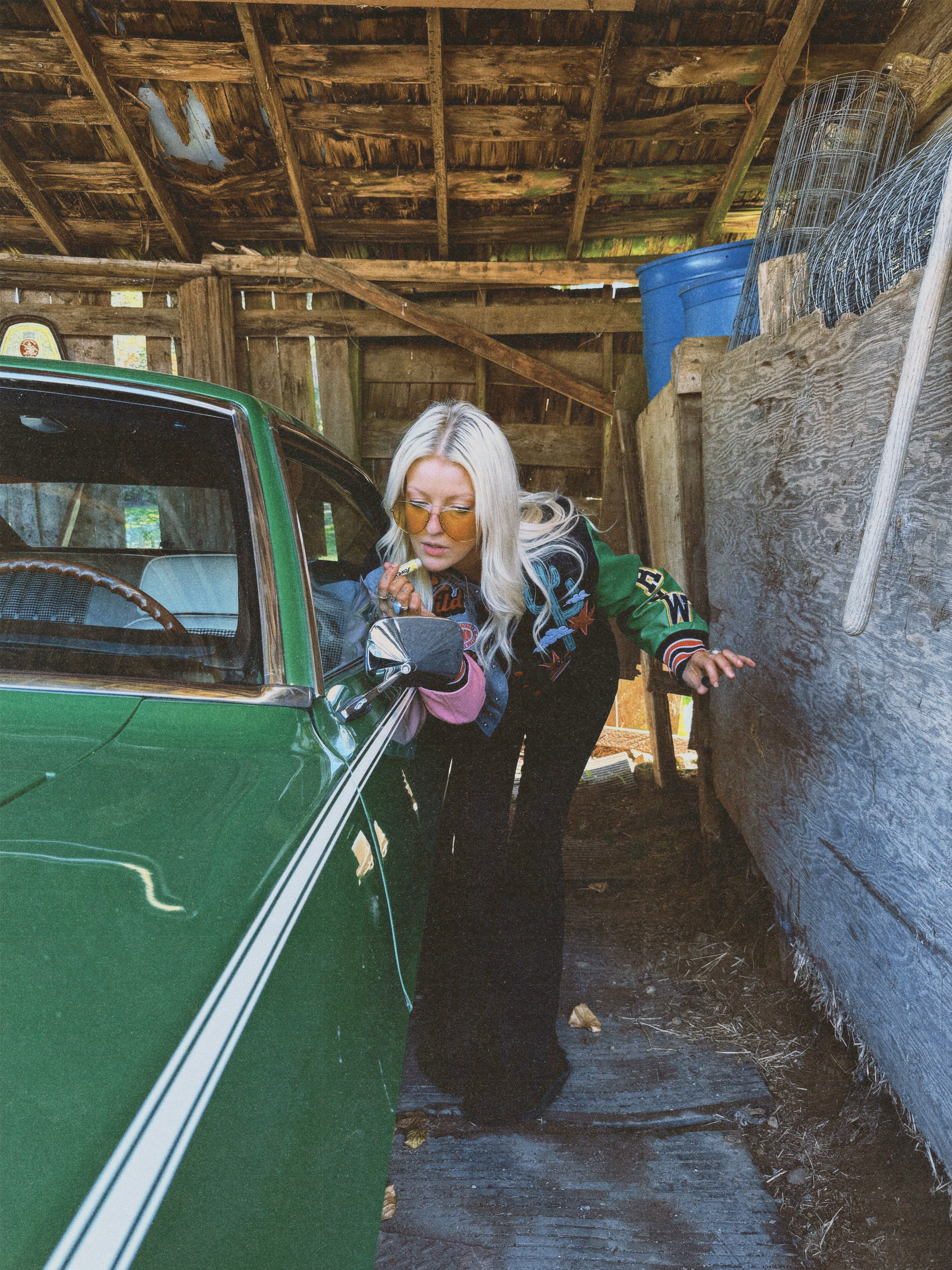 The best jacket for the ultimate party cowgirl! A cropped varsity jacket with contrast sleeves & striped ribbing trims. It features exclusively designed multi chenille patches with chain stitches, wool melton self fabric and faux leather contrast sleeves, front double welt pockets and a snap button closure.