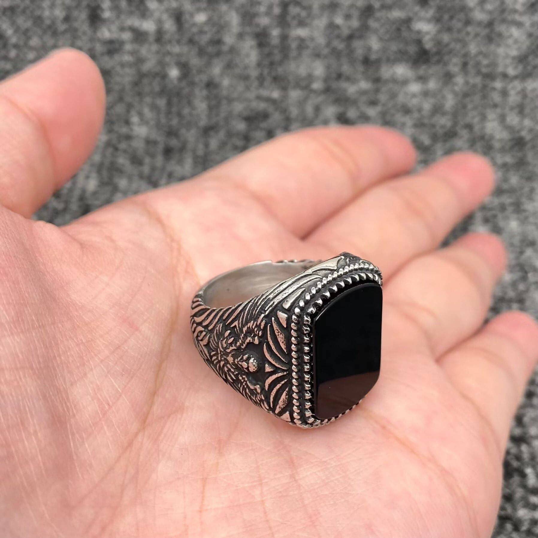 Black Agate Stainless Steel Carved Biker Ring