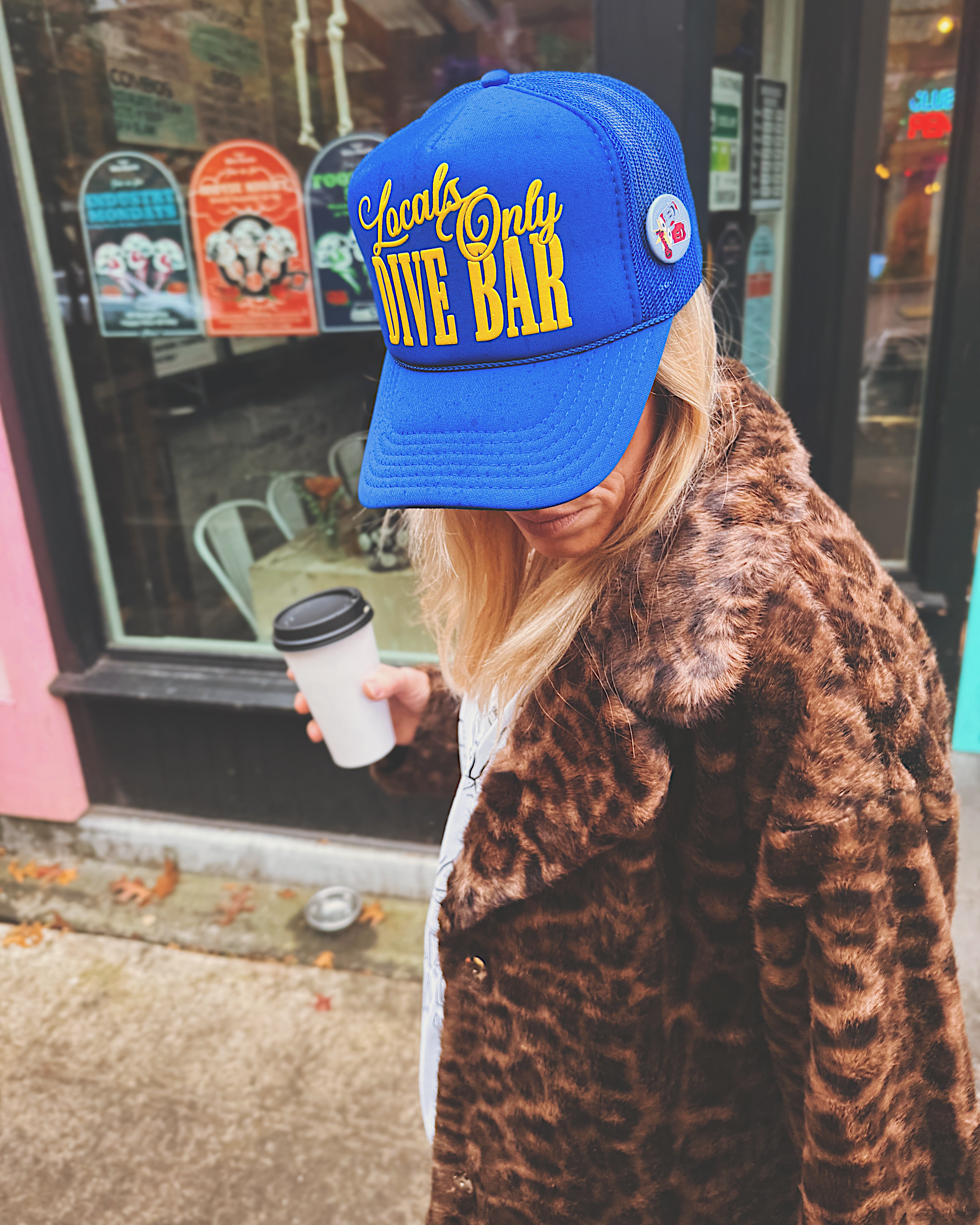 Show off your style in our Locals Only Diver Bar Country Western, trucker hat. Features the phrase "Locals Only Diver Bar" across the front in a red or gold puff ink - Comes with a removable small pin attached to each hat