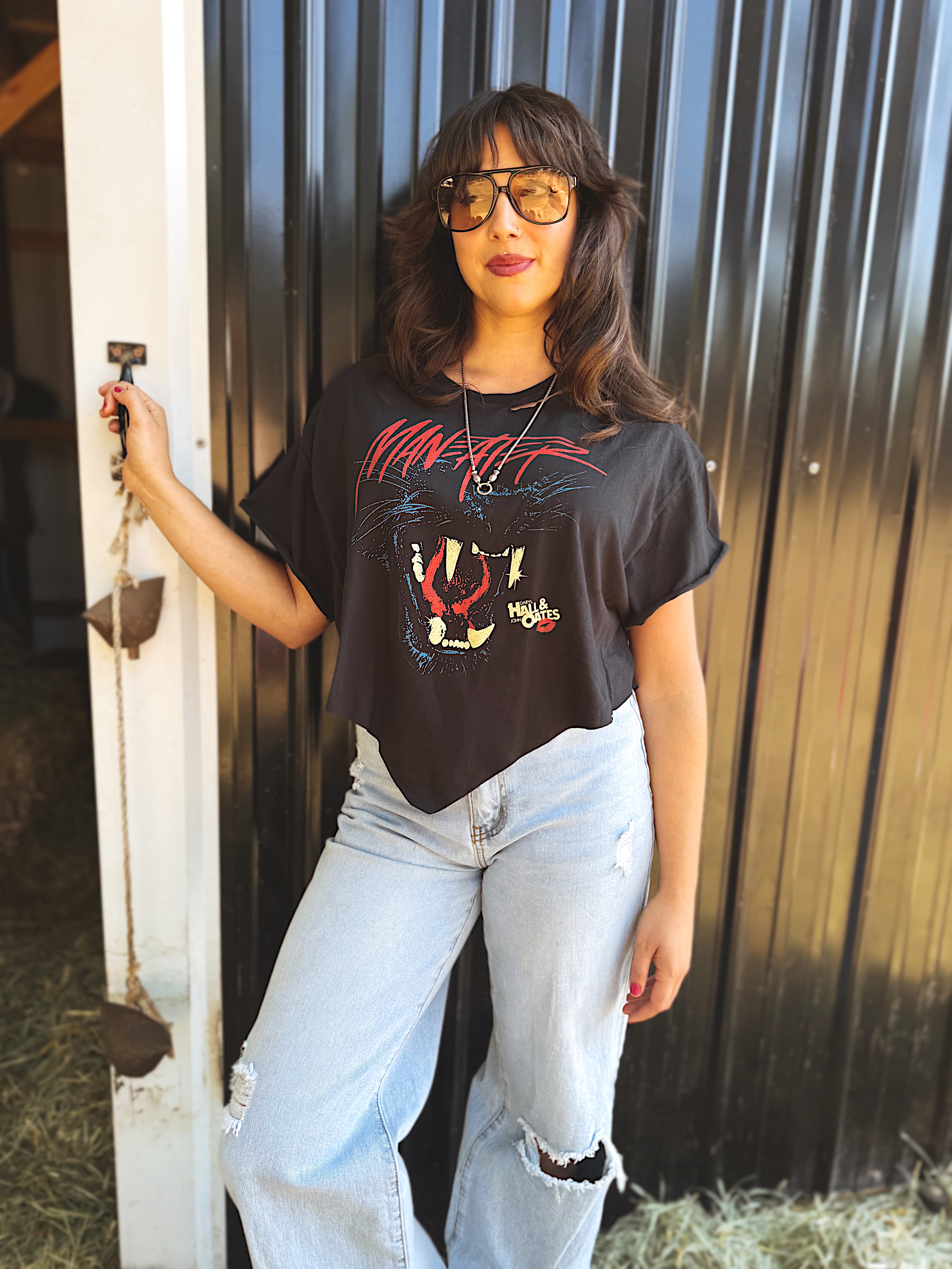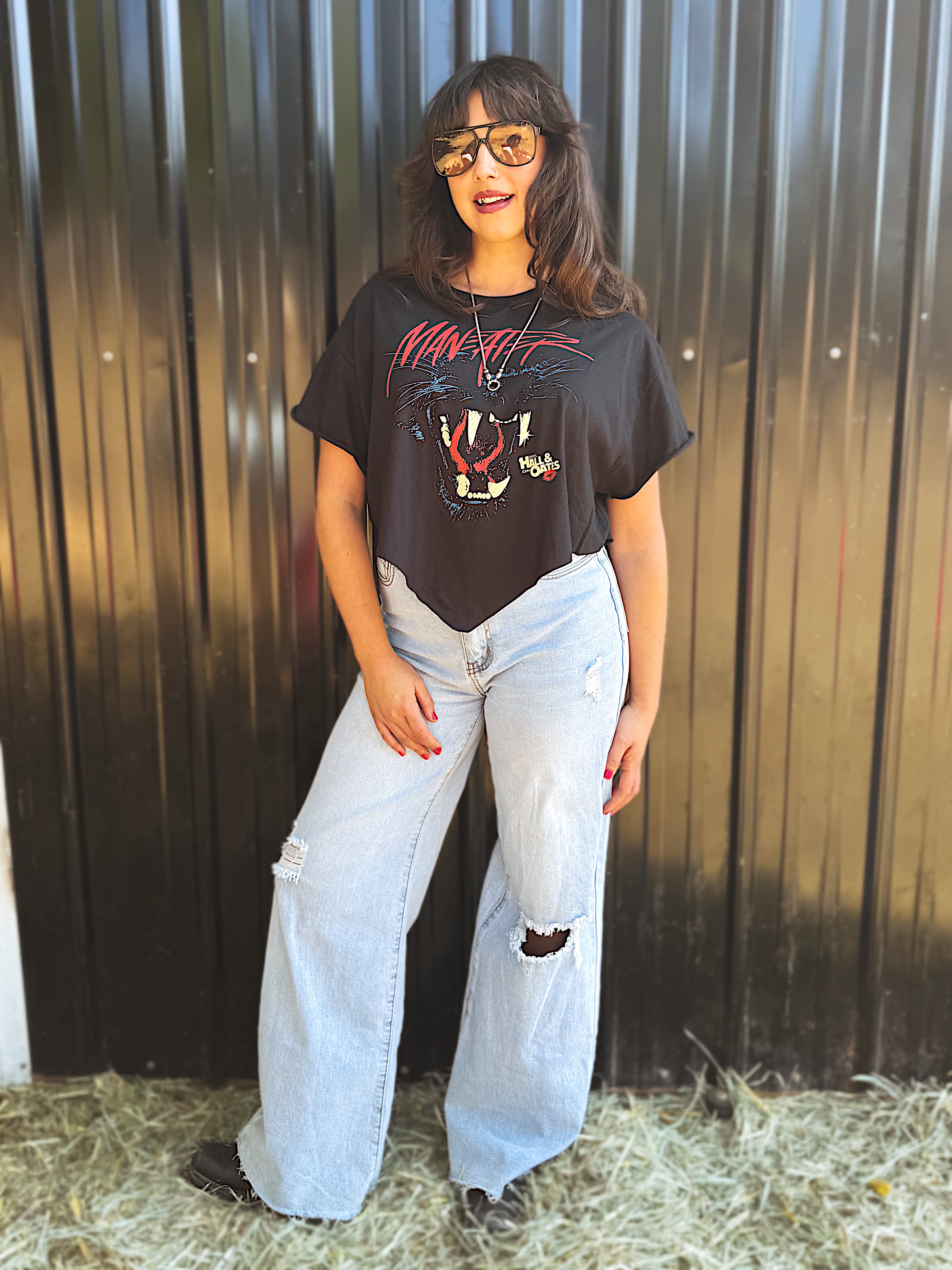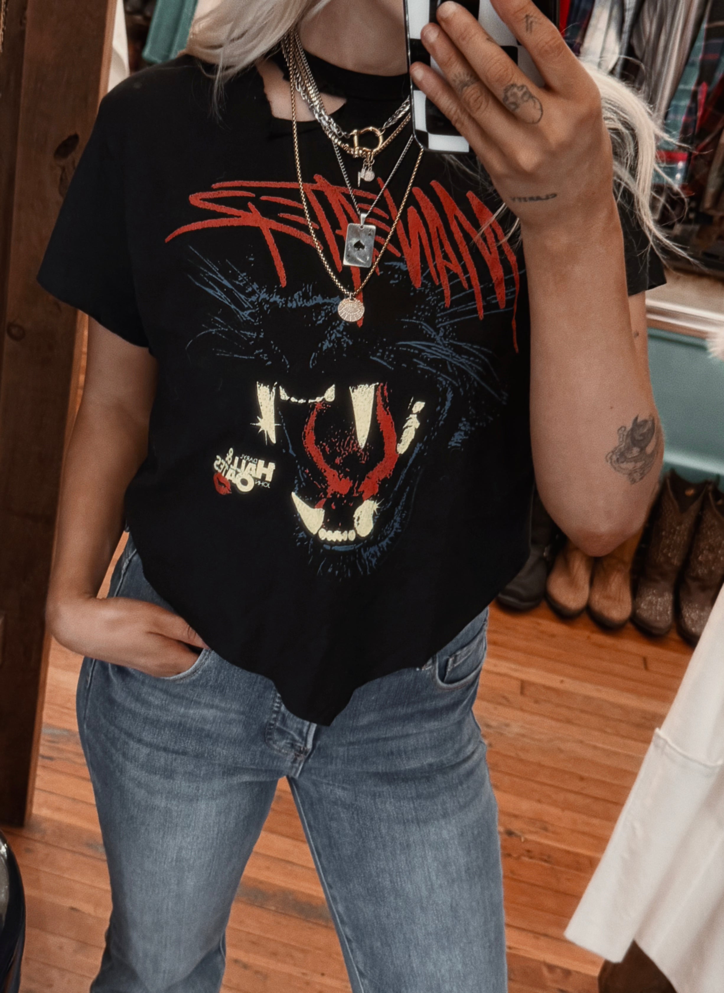 Custom Chop Maneater T-Shirt has a collar slit detail, capped sleeve, and chopped V shaped bottom. Each Custom Chop Shop T-shirt will be unique as each is hand created.