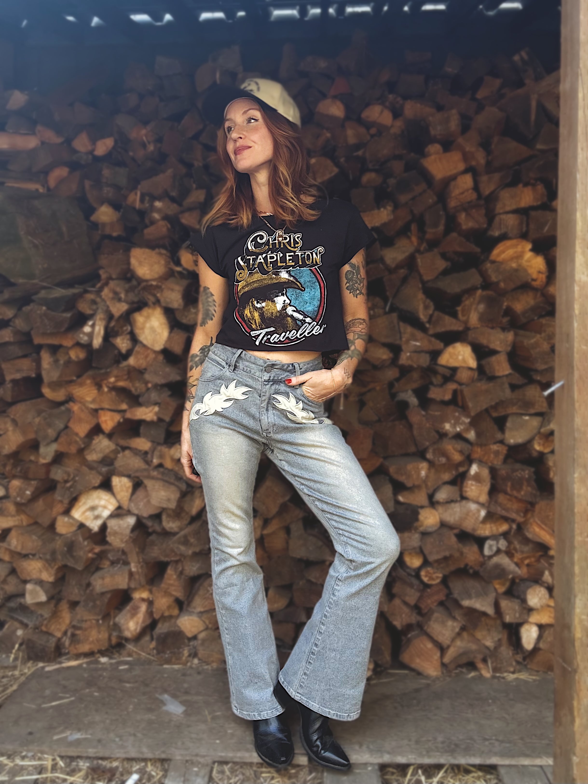 Mid-rise denim jeans featuring Western-inspired contrast patch stitching and a stretch fit for comfort.