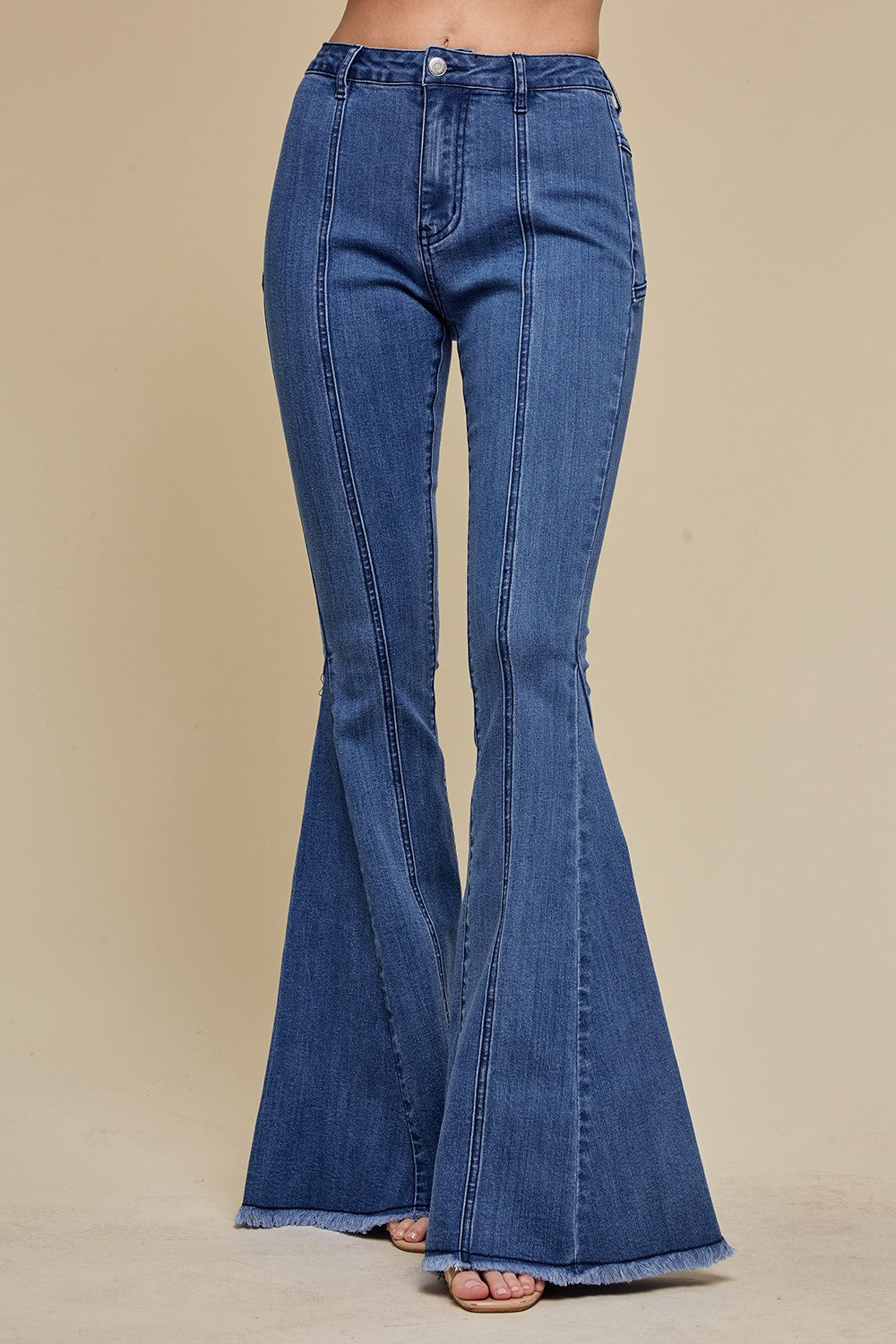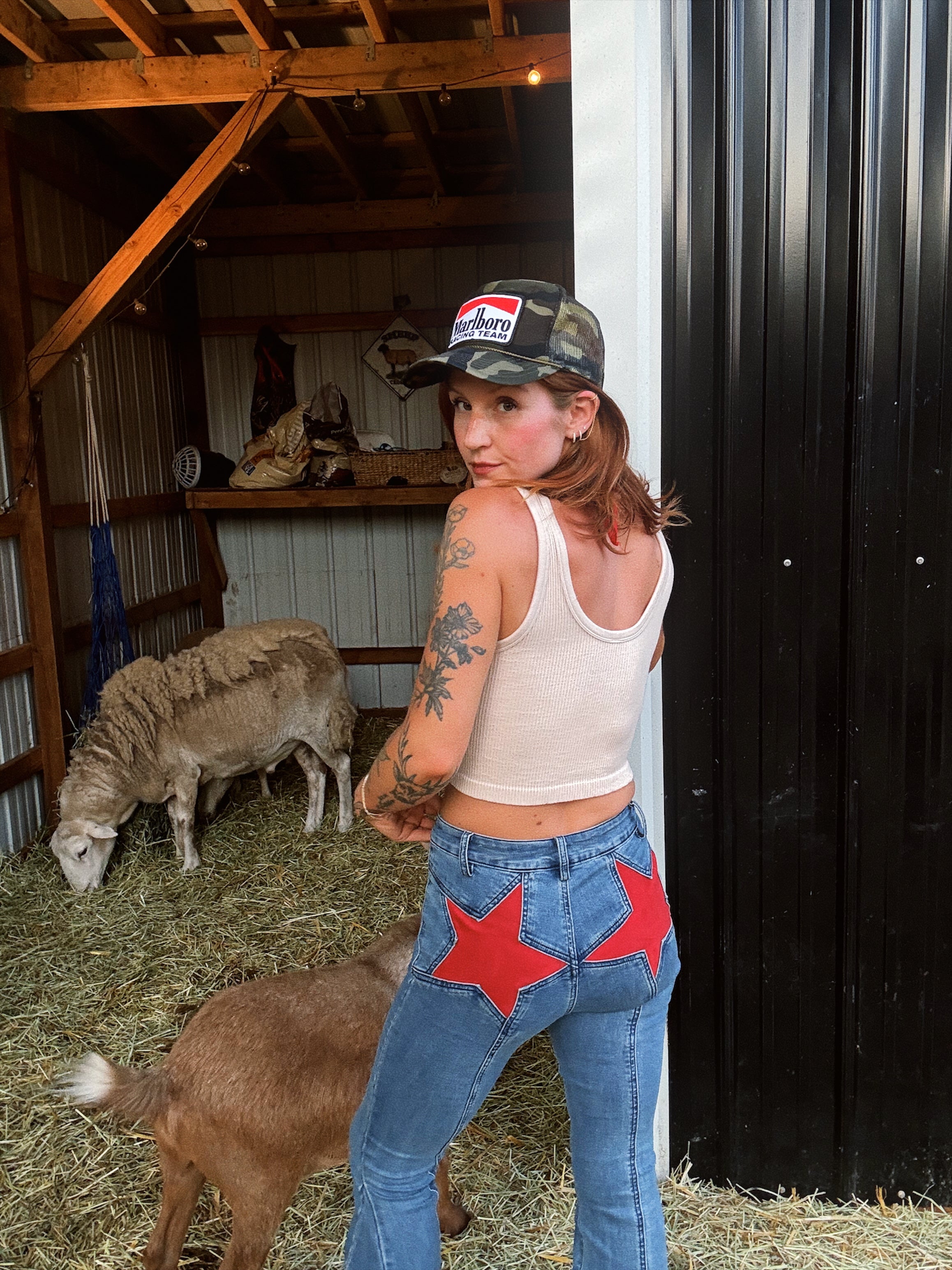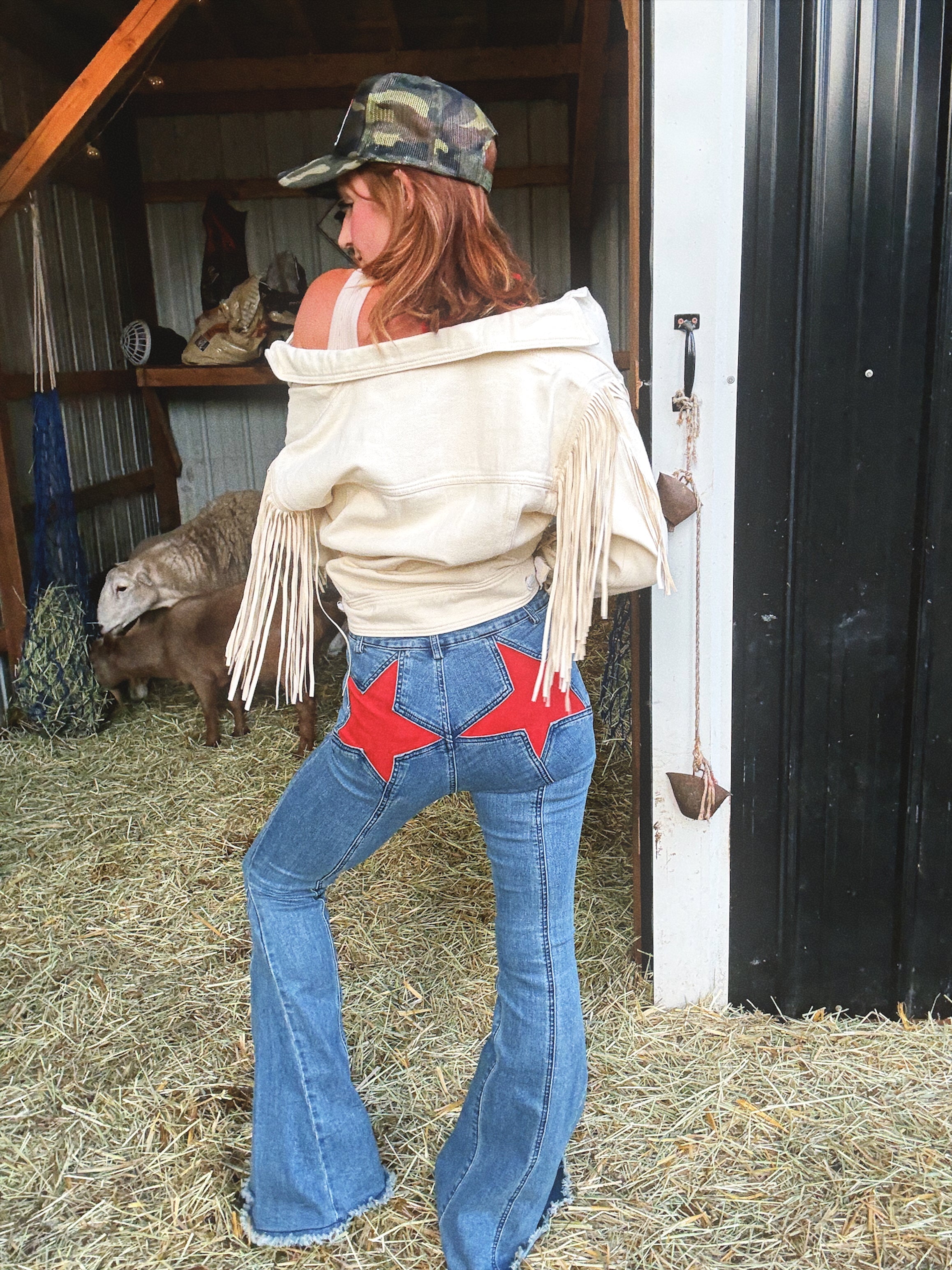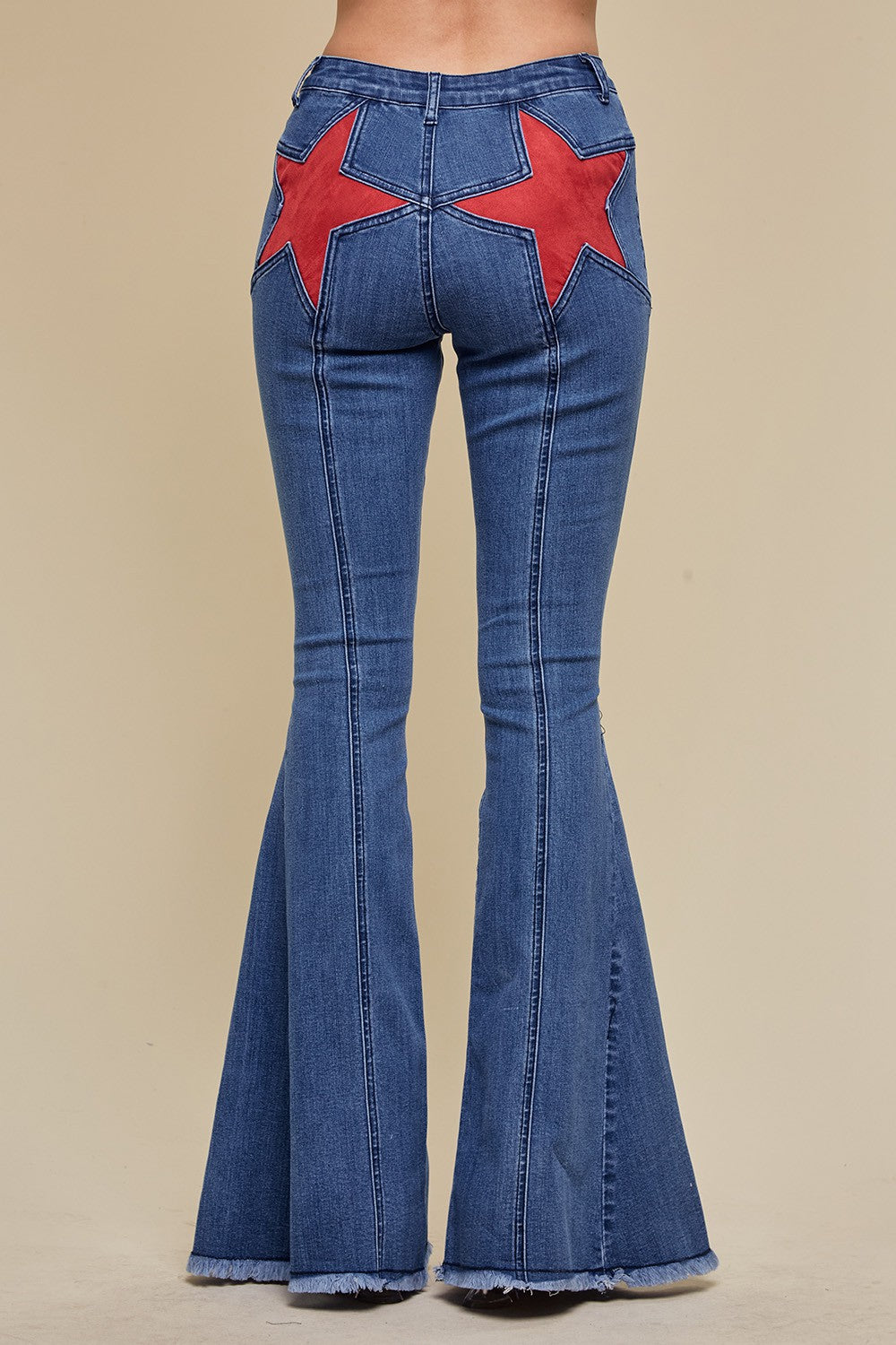 These ultra- stretchy high waisted, bell bottom jeans are the piece for summer. With suede red star back details these are your new favorite statement pant.