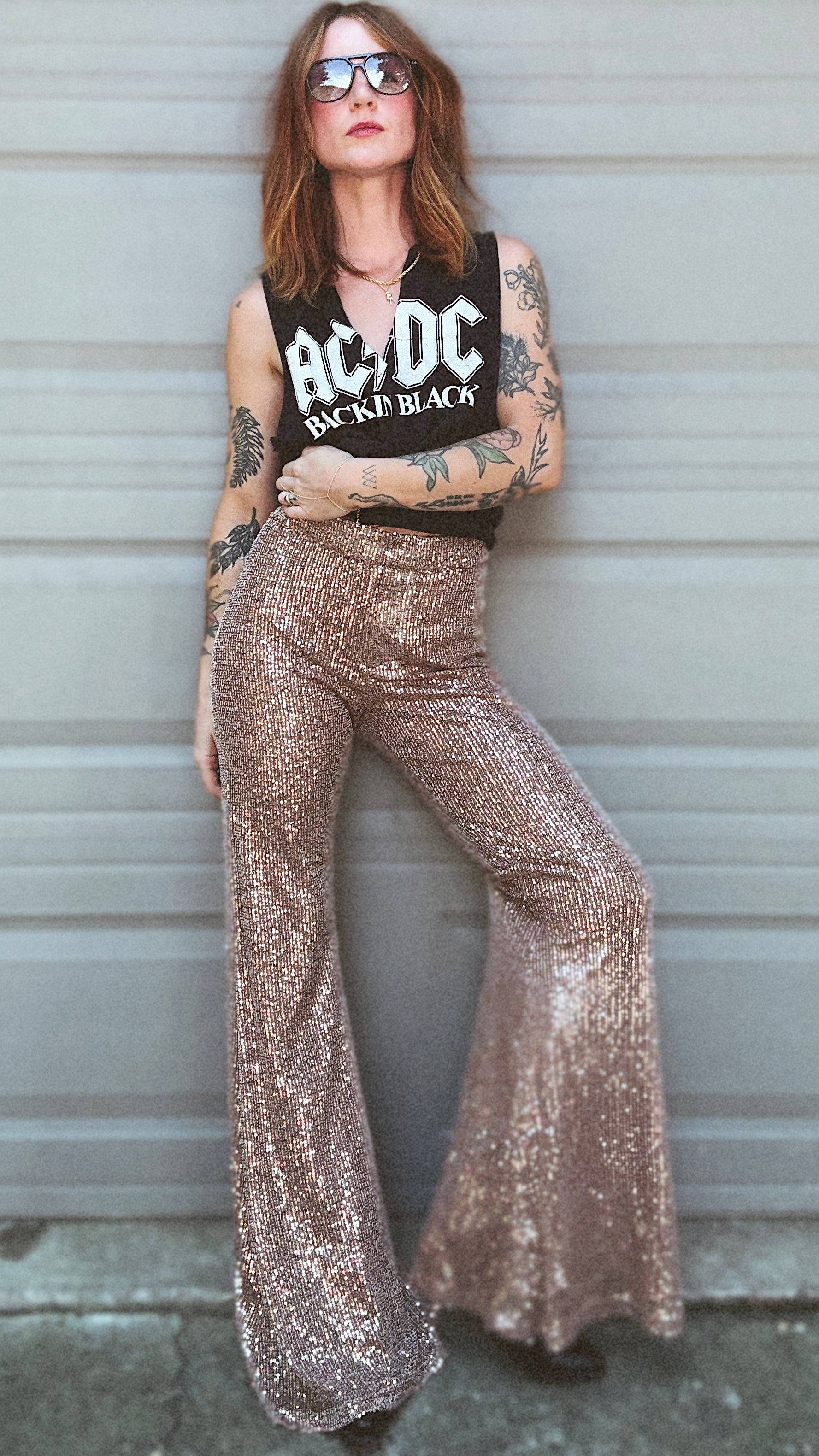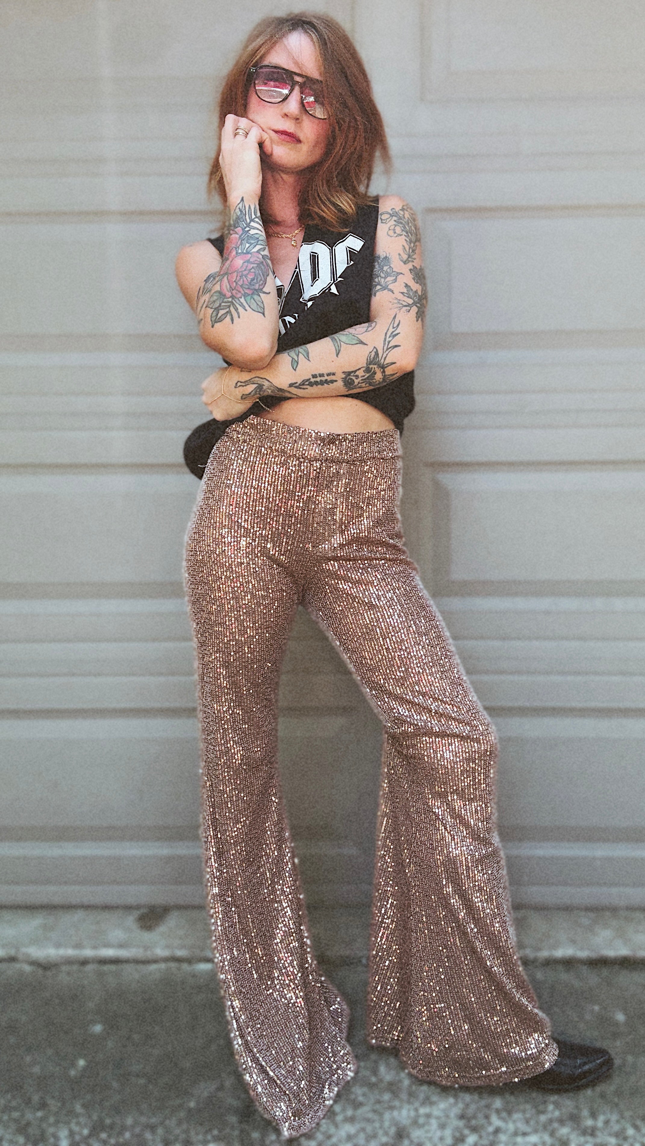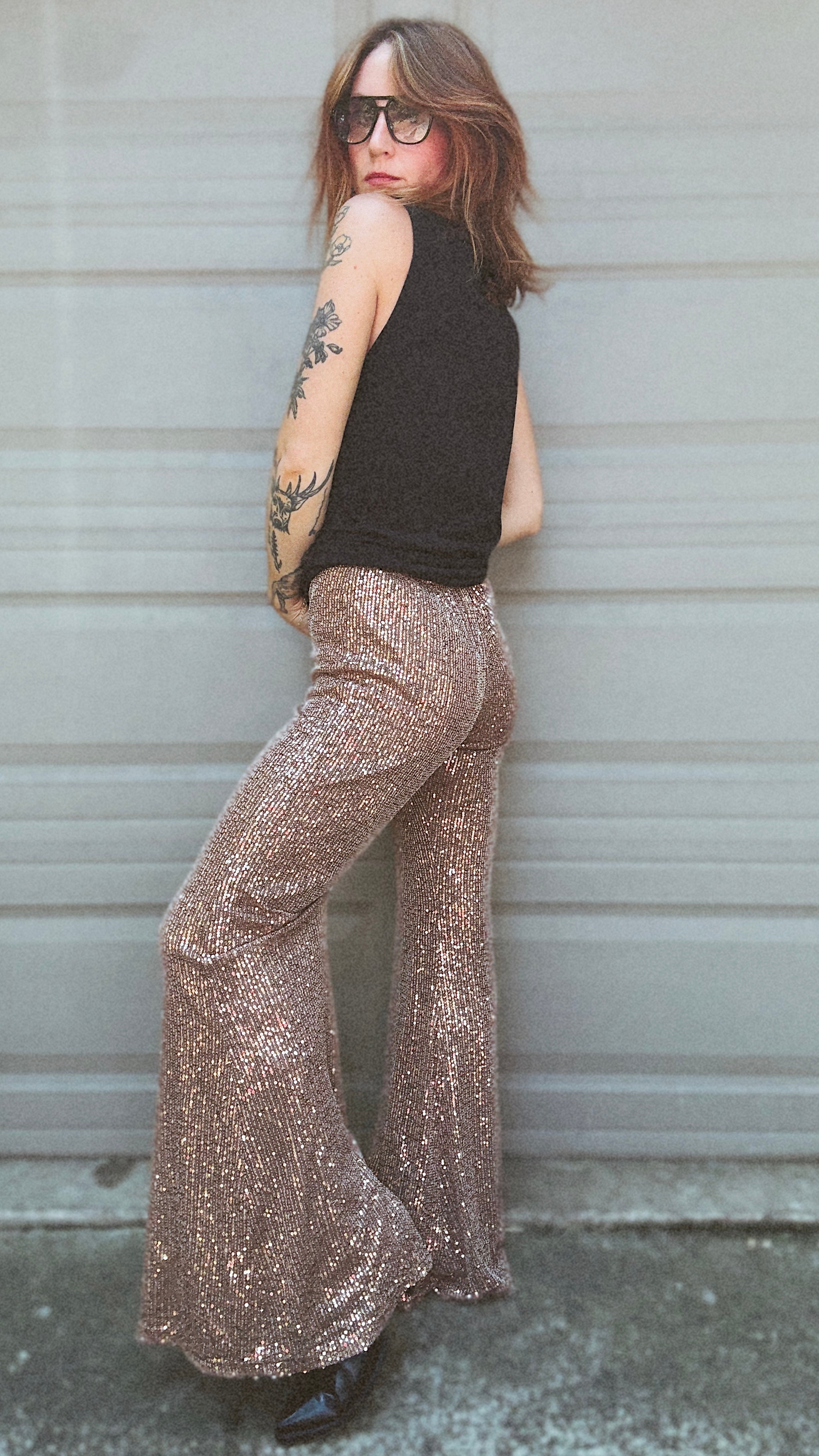 These daring sequin bell bottoms are for the stage. For the special moments. Don't blend in stand out and shine with our Dolly bell bottoms. Fully Lined, with a hook and zipper closure. A small elastic detail on the back of the waist so they stay tailored.