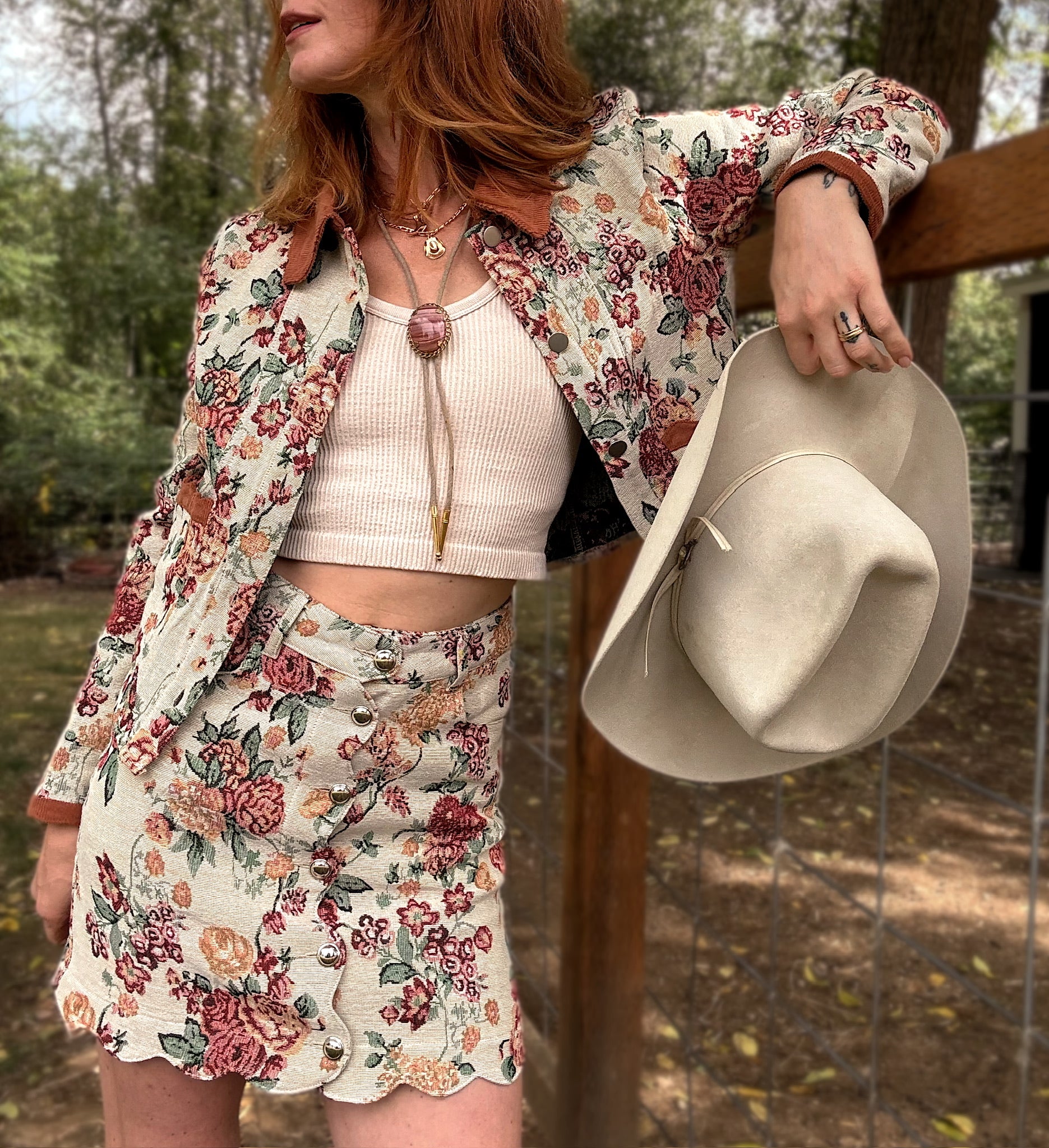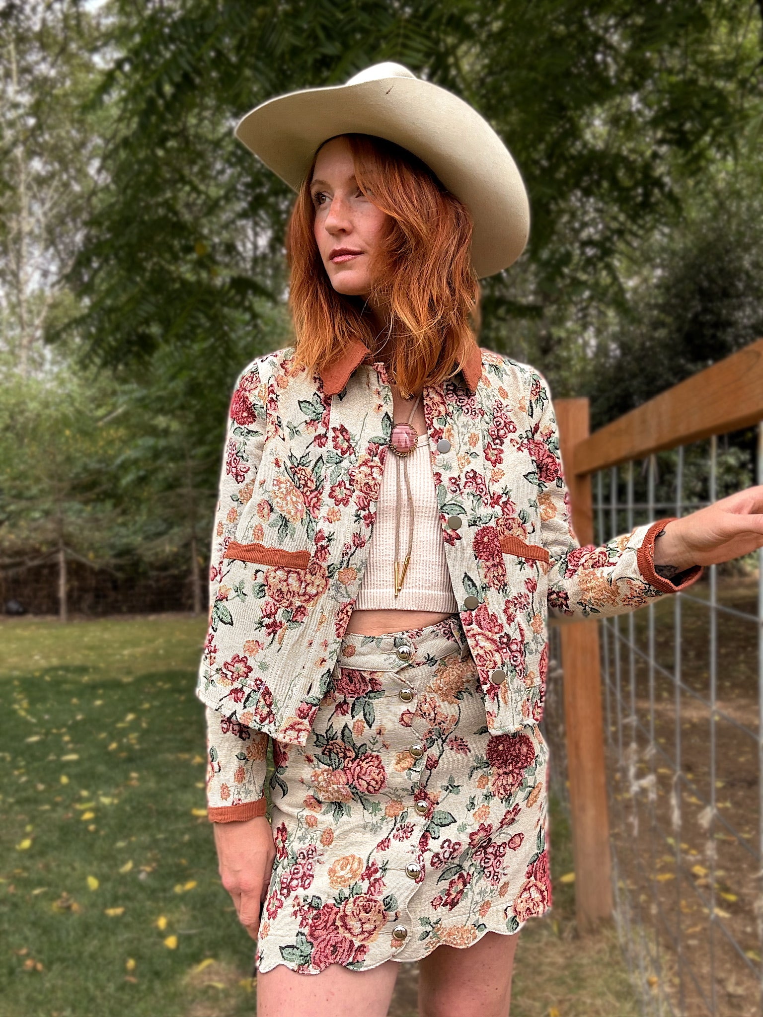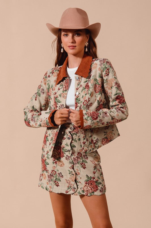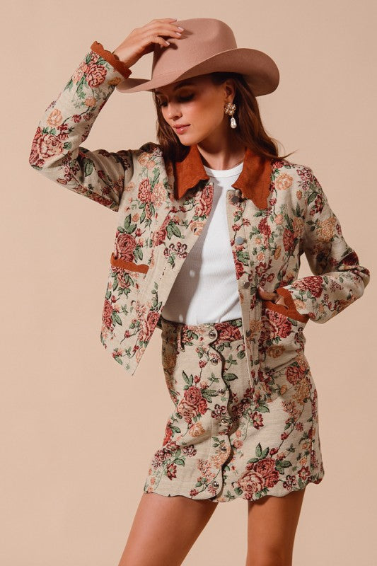 Stand out in the crowd with the Letting Me Down Jacquard Tapestry Mini Skirt, designed to turn heads. This bold piece features intricate jacquard detailing that adds texture and depth, while its mini length boldly showcases your confidence. Pair it with the matching jacket for an unforgettable look that commands attention at every step. Perfect for those who aren't afraid to stand out and own their unique style.