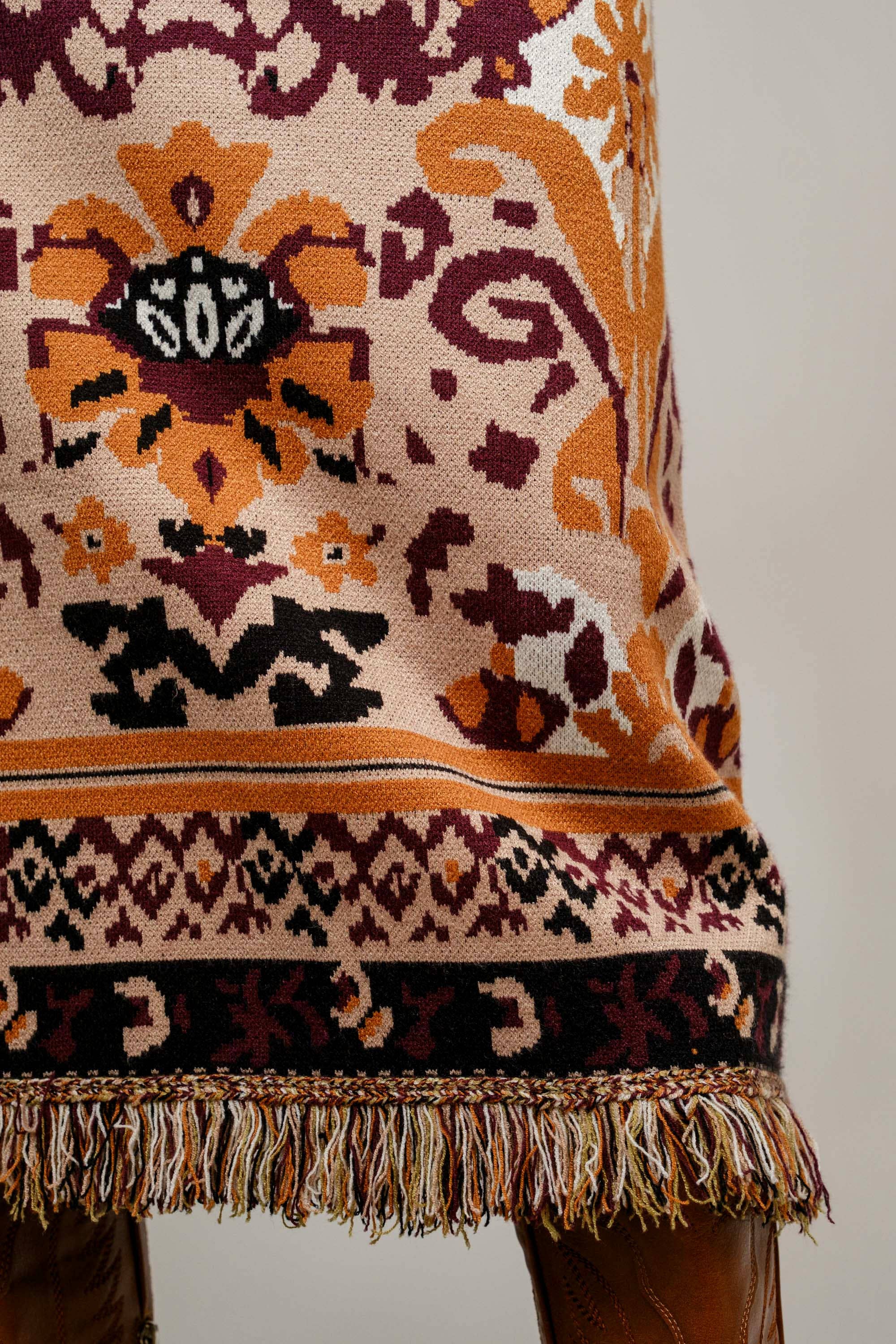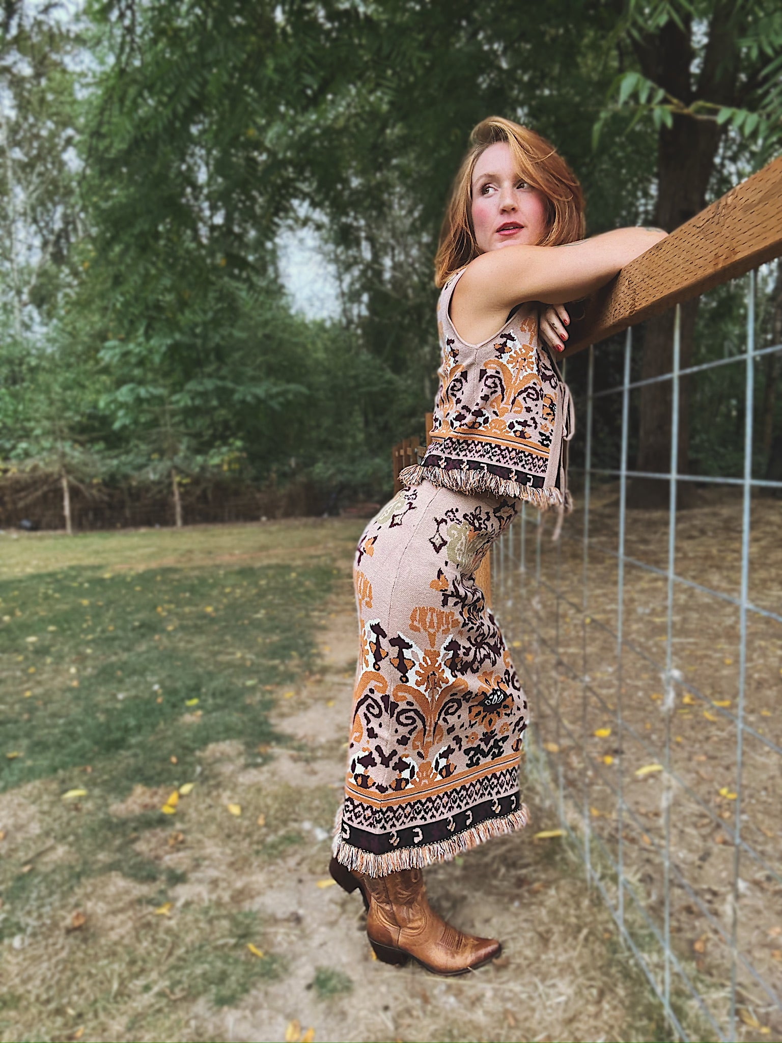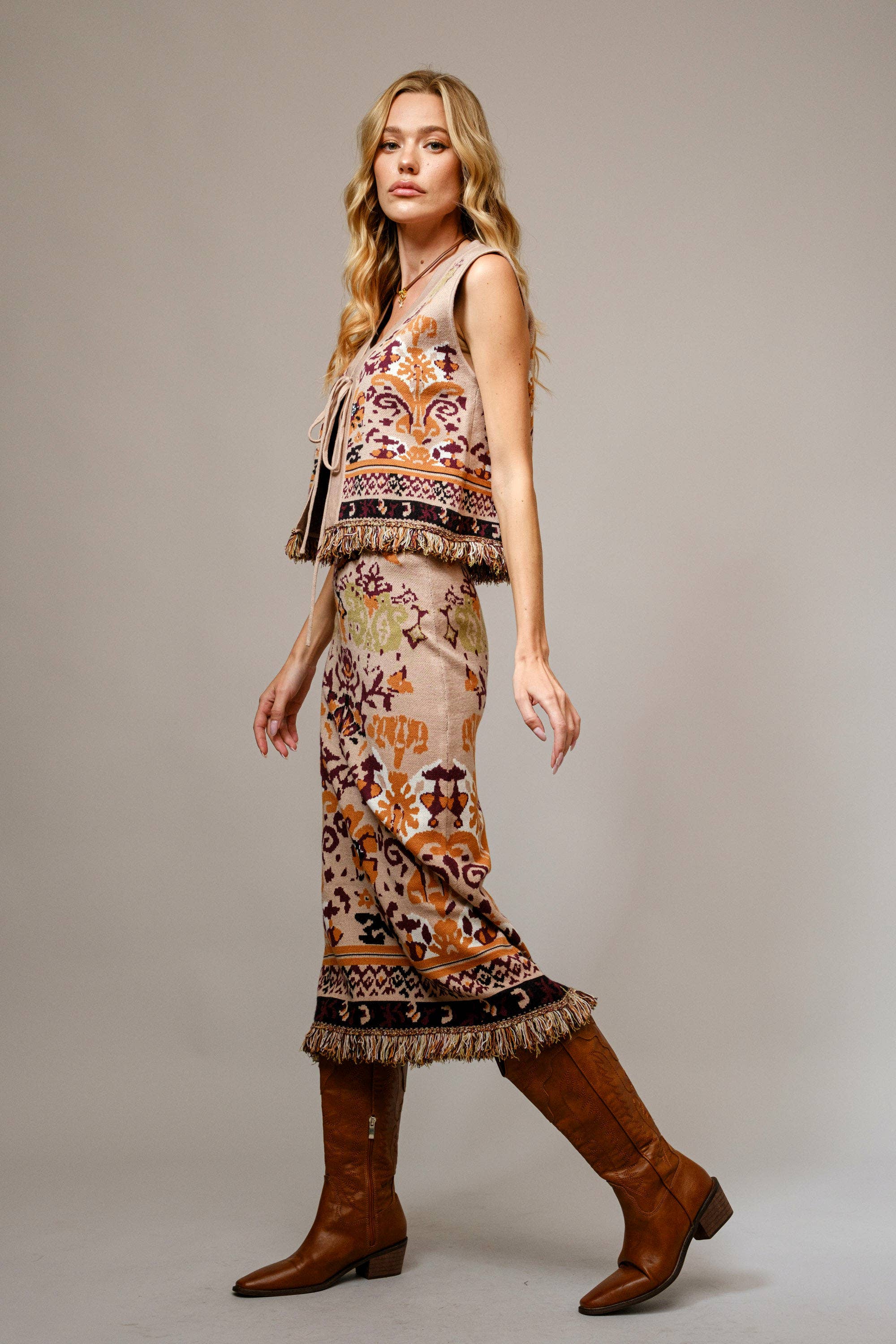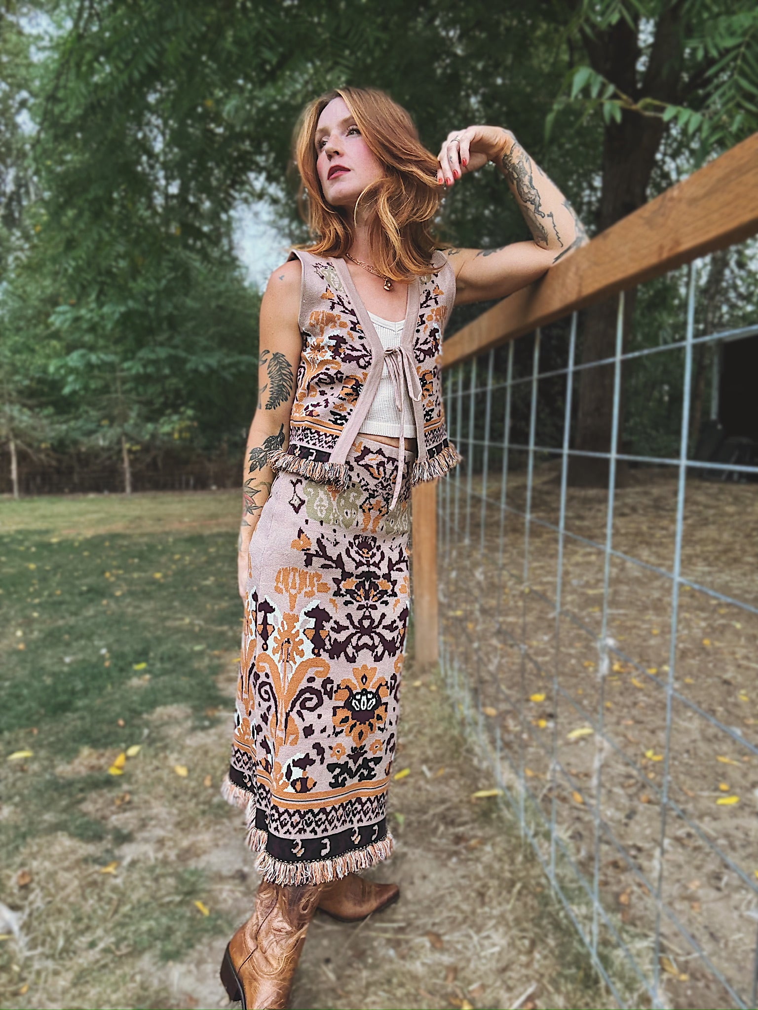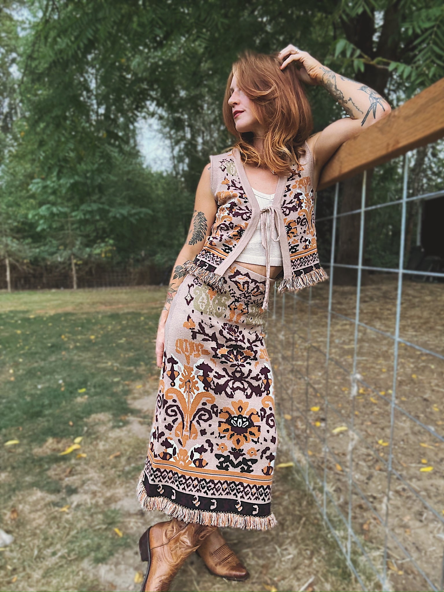 70s glam dreams come true, through this midi sweater skirt. With a fringe hem, and elastic waistband this is a must have. On its own or paired with the Smoke On The Water Tie Vest. Stretch sweater material, midi length. Can be worn as mid-high rise.
