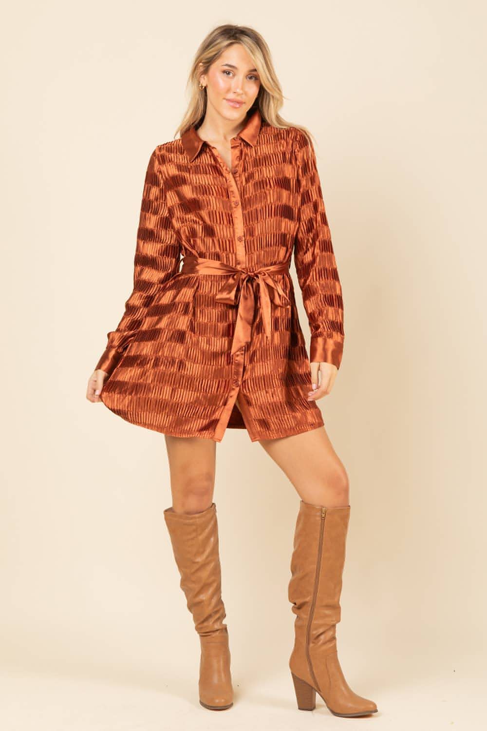 Turn heads this winter with the Lustre Luxe Wrap Dress, a perfect blend of elegance and sophistication. Crafted from sumptuous pleated satin, this long-sleeve button-down dress features a flattering wrap silhouette that cinches at the waist for a custom fit. The shimmering fabric adds a touch of glamour, making it ideal for holiday soirées, winter weddings, or an elegant night out. Stay chic and comfortable in this timeless design that's as versatile as it is luxurious.