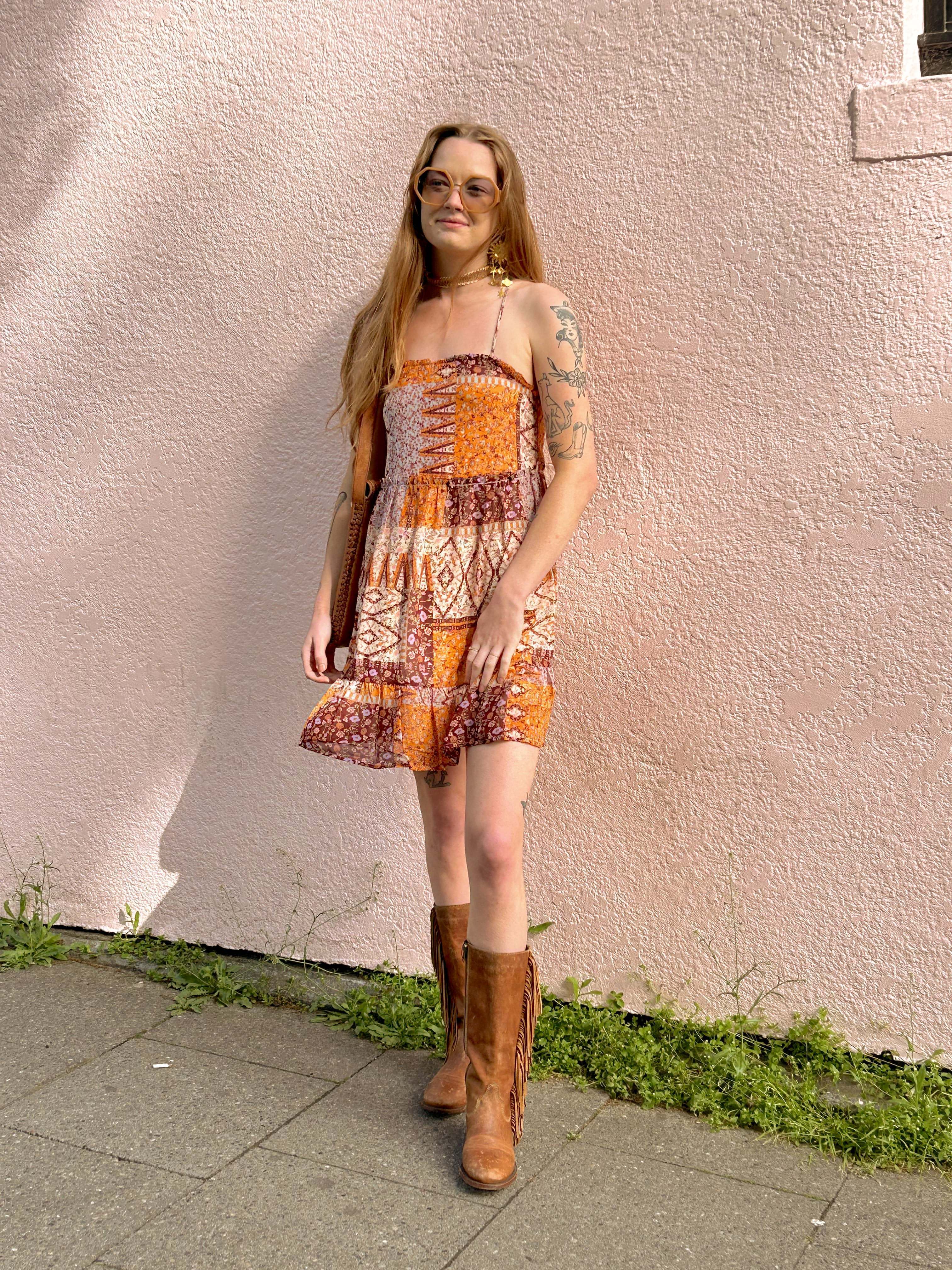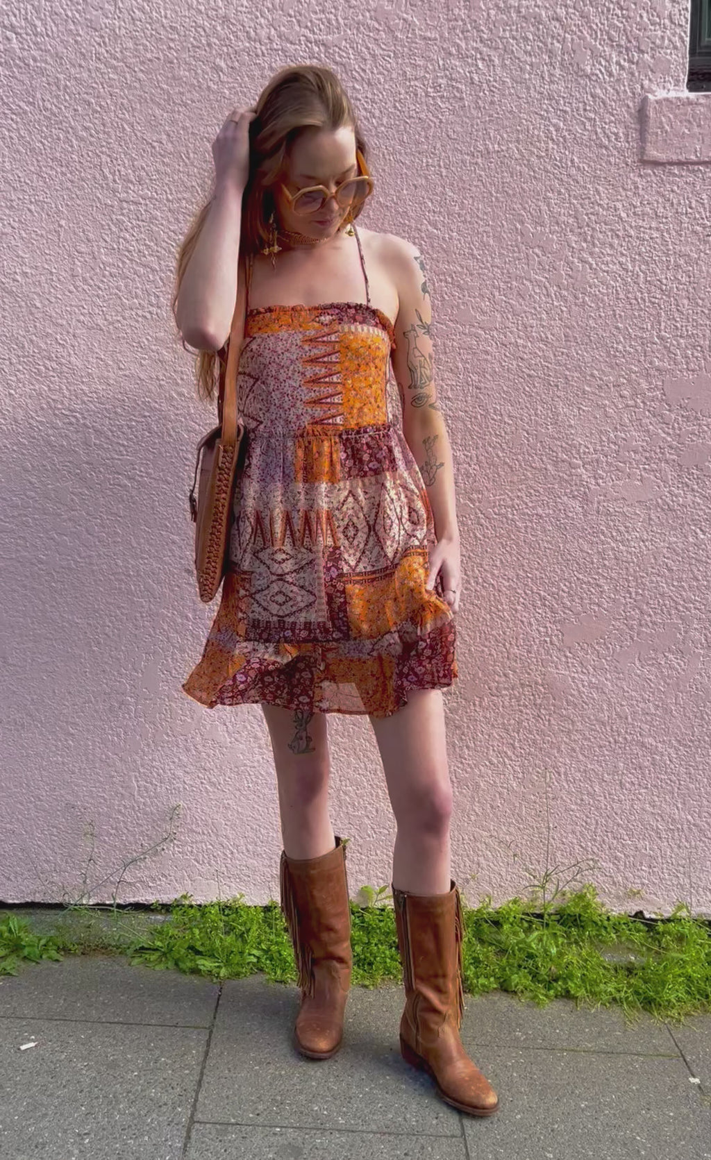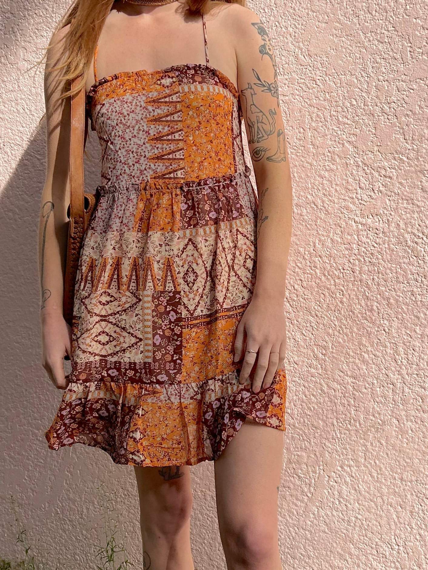 Effortlessly sweeten your look with the Capri Patchwork Mini Dress. This charming dress boasts a frill hem and square neckline, complemented by a stylish patchwork print. The adjustable tie closure at the back adds a customizable touch, offering both comfort and style.