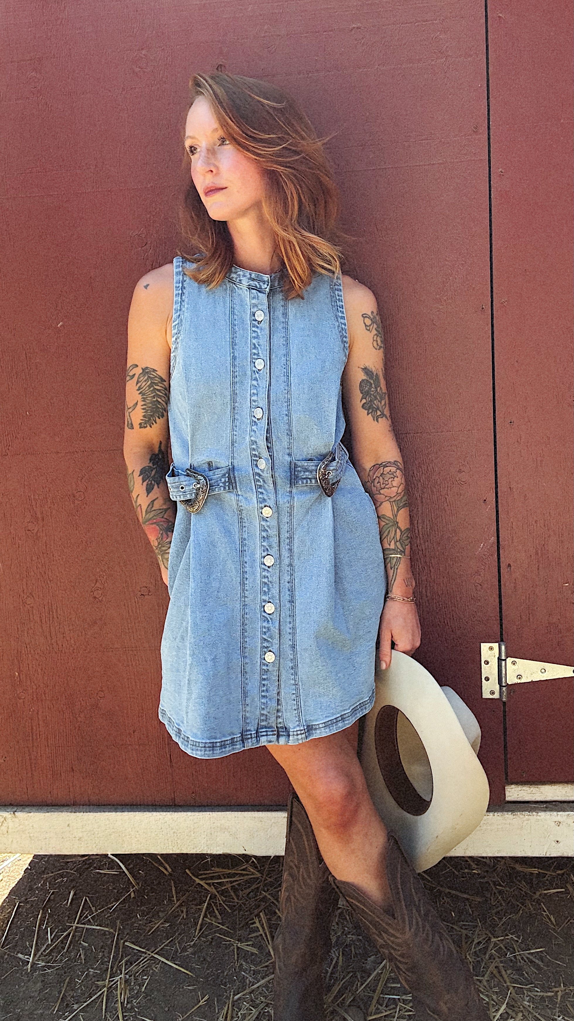 Mini denim dress with a button-up front, sleeveless design, and western buckle belt detail. Features a slight stretch for comfort and a flattering fit.
