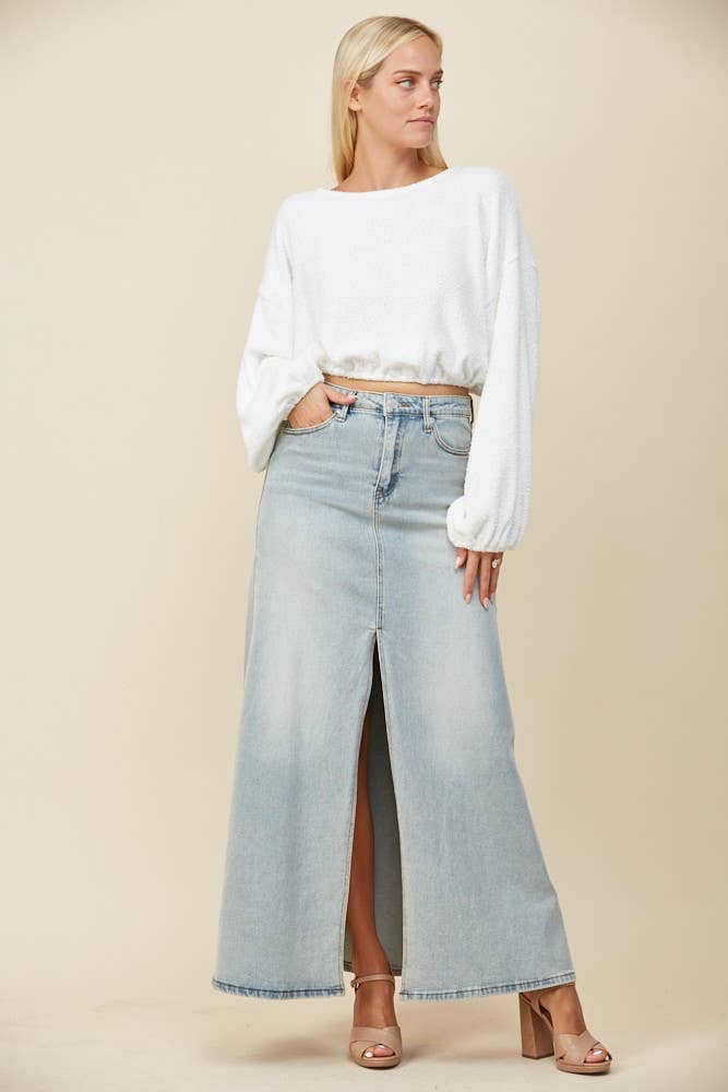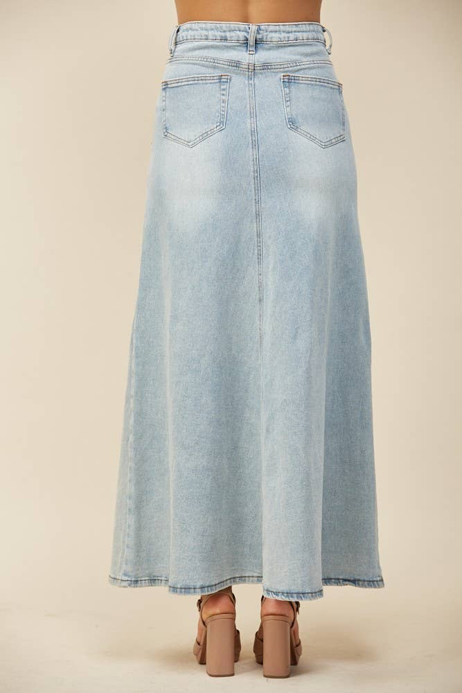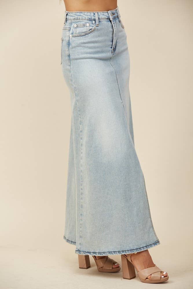 Our Sadie denim maxi skirt is the perfect everyday piece for your summer and fall outfits, with a knee high slit in the middle you have the perfect opportunity to show off your boots!